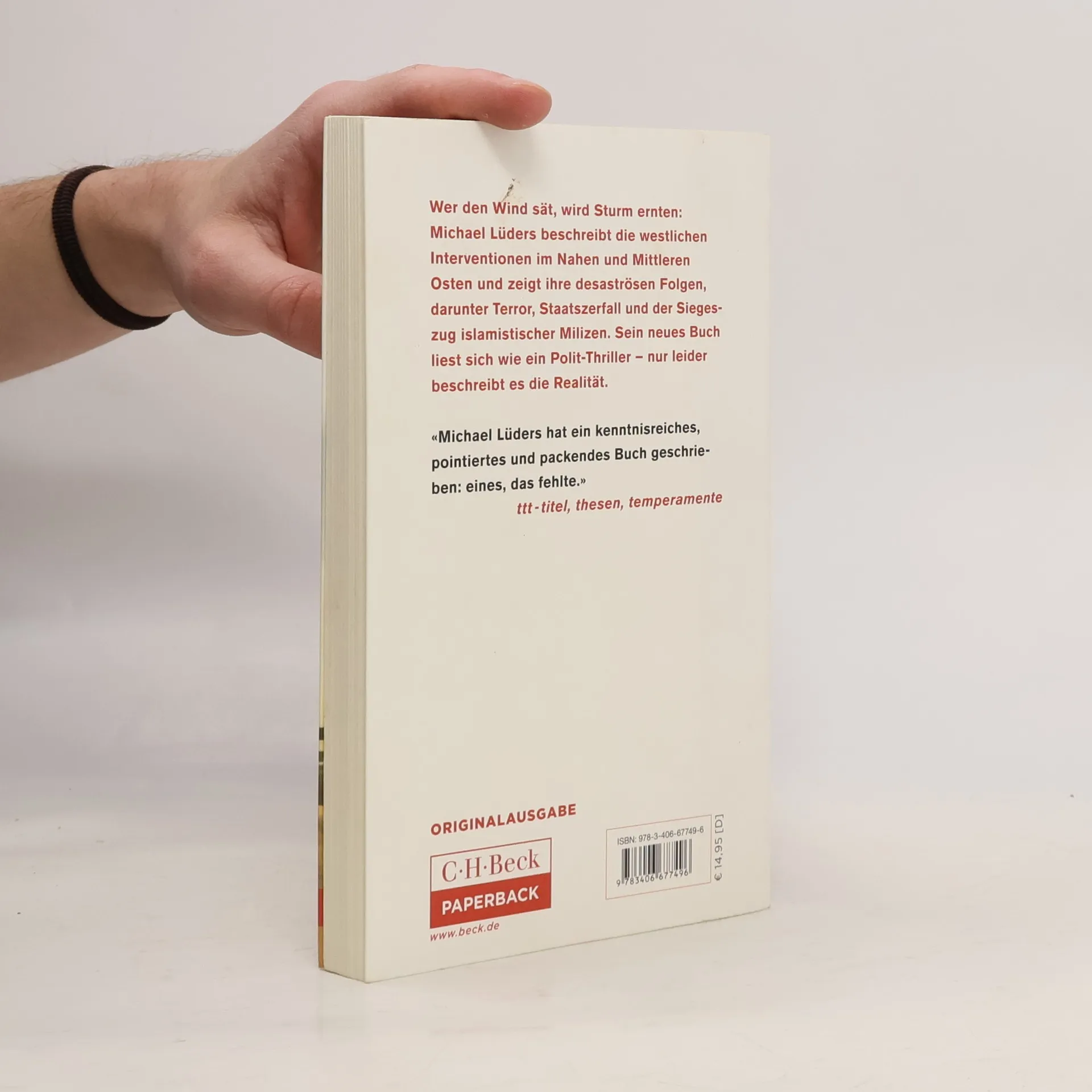 „LIEST SICH WIE EIN POLIT-THRILLER“ BERND SCHEKAUSKI, MDR FIGARO Wer den Wind sät, wird Sturm ernten - Michael Lüders beschreibt die westlichen Interventionen im Nahen und Mittleren Osten seit der Kolonialzeit und erklärt, was sie mit der aktuellen politischen Situation zu tun haben. Sein neues Buch liest sich wie ein Polit-Thriller - nur leider beschreibt es die Realität. Eine Geschichte erscheint in unterschiedlichem Licht, je nachdem, wo man beginnt sie zu erzählen. Und wir sind vergesslich. Das iranische Verhältnis zum Westen versteht nur, wer den von CIA und MI6 eingefädelten Sturz des demokratischen Ministerpräsidenten Mossadegh im Jahr 1953 berücksichtigt. Ohne den Irakkrieg von 2003 und die westliche Politik gegenüber Assad in Syrien lässt sich der Erfolg des „Islamischen Staates“ nicht begreifen. Wer wissen will, wie in der Region alles mit allem zusammenhängt, der greife zu diesem Schwarzbuch der westlichen Politik im Orient. Die verheerenden Folgen westlicher Politik im Orient Geschrieben von einem der besten Kenner