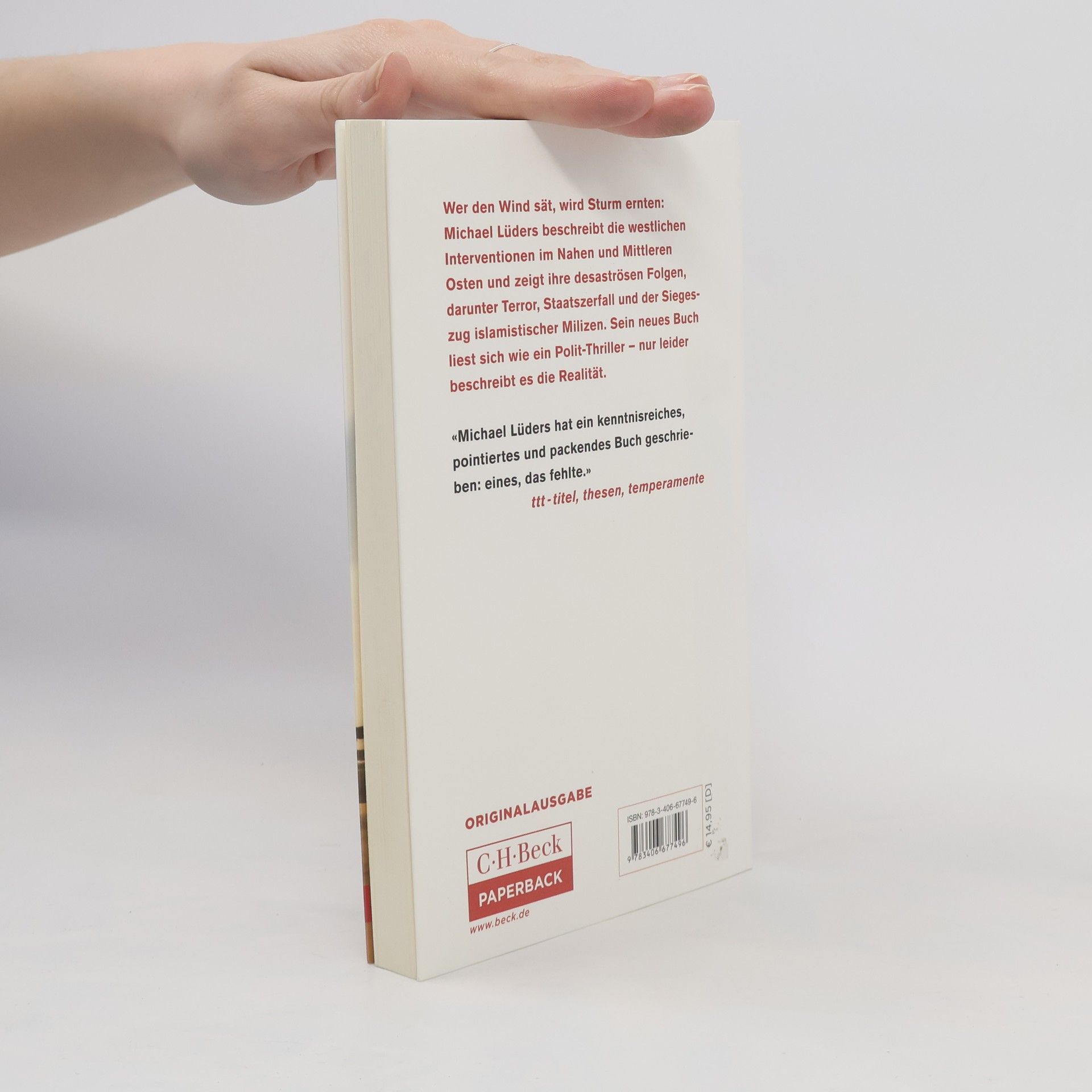 „LIEST SICH WIE EIN POLIT-THRILLER“ BERND SCHEKAUSKI, MDR FIGARO Wer den Wind sät, wird Sturm ernten - Michael Lüders beschreibt die westlichen Interventionen im Nahen und Mittleren Osten seit der Kolonialzeit und erklärt, was sie mit der aktuellen politischen Situation zu tun haben. Sein neues Buch liest sich wie ein Polit-Thriller - nur leider beschreibt es die Realität. Eine Geschichte erscheint in unterschiedlichem Licht, je nachdem, wo man beginnt sie zu erzählen. Und wir sind vergesslich. Das iranische Verhältnis zum Westen versteht nur, wer den von CIA und MI6 eingefädelten Sturz des demokratischen Ministerpräsidenten Mossadegh im Jahr 1953 berücksichtigt. Ohne den Irakkrieg von 2003 und die westliche Politik gegenüber Assad in Syrien lässt sich der Erfolg des „Islamischen Staates“ nicht begreifen. Wer wissen will, wie in der Region alles mit allem zusammenhängt, der greife zu diesem Schwarzbuch der westlichen Politik im Orient. Die verheerenden Folgen westlicher Politik im Orient Geschrieben von einem der besten Kenner