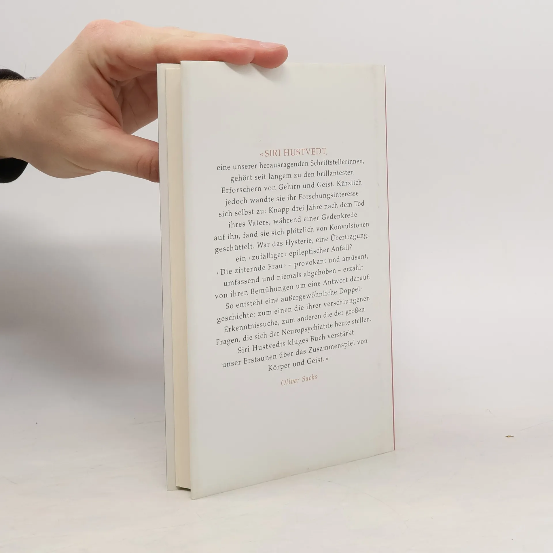 «Siri Hustvedt, eine unserer herausragenden Schriftstellerinnen, gehört seit langem zu den brillantesten Erforschern von Gehirn und Geist. Kürzlich jedoch wandte sie ihr Forschungsinteresse sich selbst zu: Knapp drei Jahre nach dem Tod ihres Vaters, während einer Gedenkrede auf ihn, fand sie sich plötzlich von Konvulsionen geschüttelt. War das Hysterie, eine Übertragung, ein ‹zufälliger› epileptischer Anfall? ‹Die zitternde Frau› – provokant und amüsant, umfassend und niemals abgehoben – erzählt von ihren Bemühungen um eine Antwort darauf. So entsteht eine außergewöhnliche Doppelgeschichte: zum einen die ihrer verschlungenen Erkenntnissuche, zum anderen die der großen Fragen, die sich der Neuropsychiatrie heute stellen. Siri Hustvedts kluges Buch verstärkt unser Erstaunen über das Zusammenspiel von Körper und Geist.»Oliver Sacks