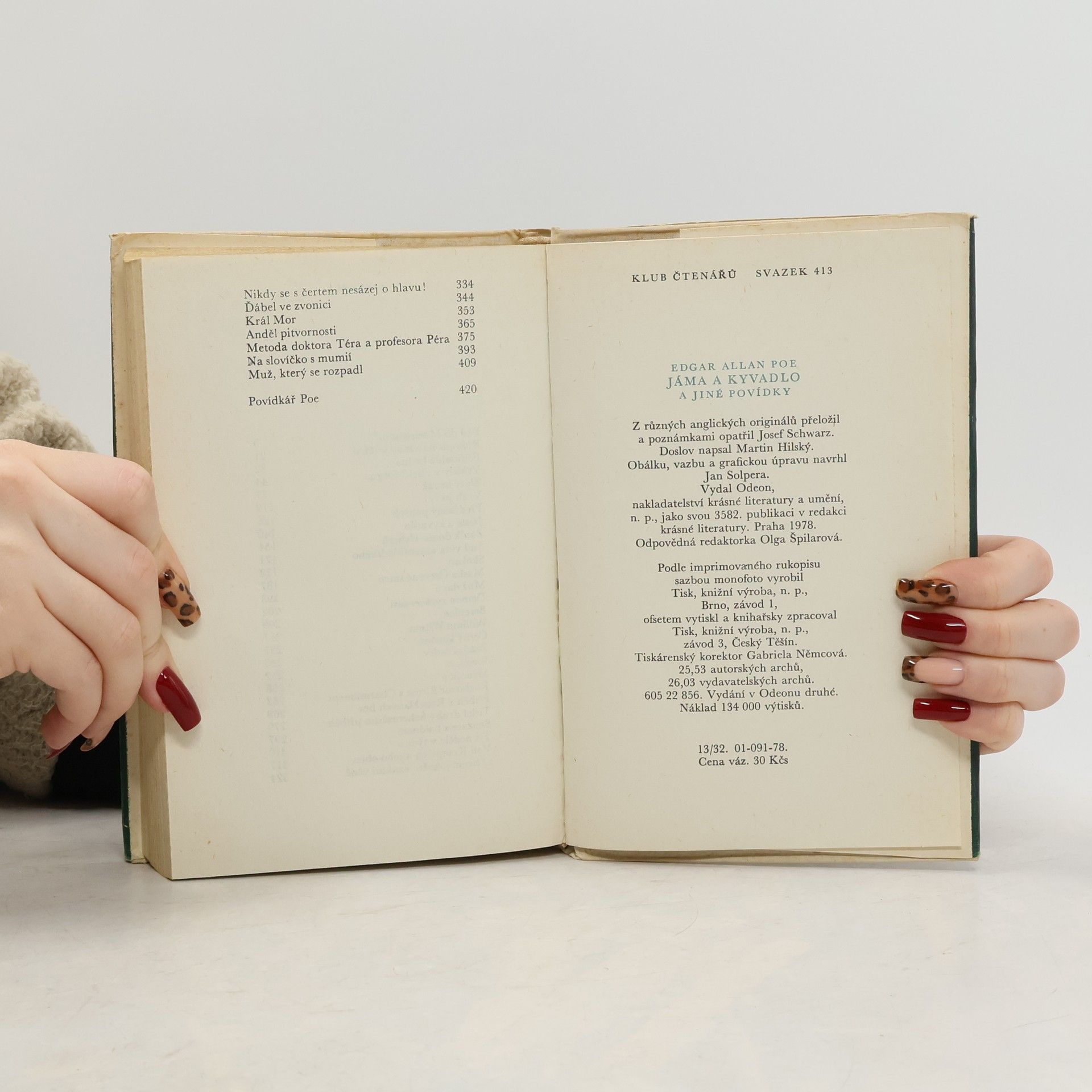 Čtyřiatřicet povídek známého spisovatele se snaží ukázat mnohotvárnost a všestrannost jeho talentu. Jde o příběhy, v nichž se jeví jako předchůdce povídky kriminální a detektivní, vědeckofantastické a jako žánru označovaného jménem horror. Autor v nich rozehrává svou jedinečnou fantazii a uplatňuje smysl pro logickou a rozumovou konstrukci. Povídky: Pád do Maelstömu, Rukopis nalezený v láhvi, Podlouhlá bedna, Vraždy v ulici Morgue, Zlatý brouk, Vrah jsi ty !, Předčasný pohřeb, Jáma a kyvadlo, Zánik domu Usherů, Sud vína amontilladského Skokan, Maska Červené smrti, Muž davu, Démon zvrácenosti, Berenice, William Wilson, Černý kocour, Zrádné srdce, Eleonora, Medailón, Rozhovor Eirose s Charmionem, Příběh z Rozeklaných hor, Tisící druhý Šeherezádin příběh, Senzace s balónem, Tři neděle v týdnu, Von Kempelen a jeho objev, O šizení jakožto exaktní vědě, Nikdy se s čertem nesázej o hlavu !, Ďábel ve zvonici, Král Mor, Anděl pitvornosti, Metoda doktora Téra a profesora Péra, Na slovíčko s mumií, Muž, který se rozpadl. Povídkář Poe. Vydání v Odeonu druhé. Edice Klub čtenářů, svazek 413.