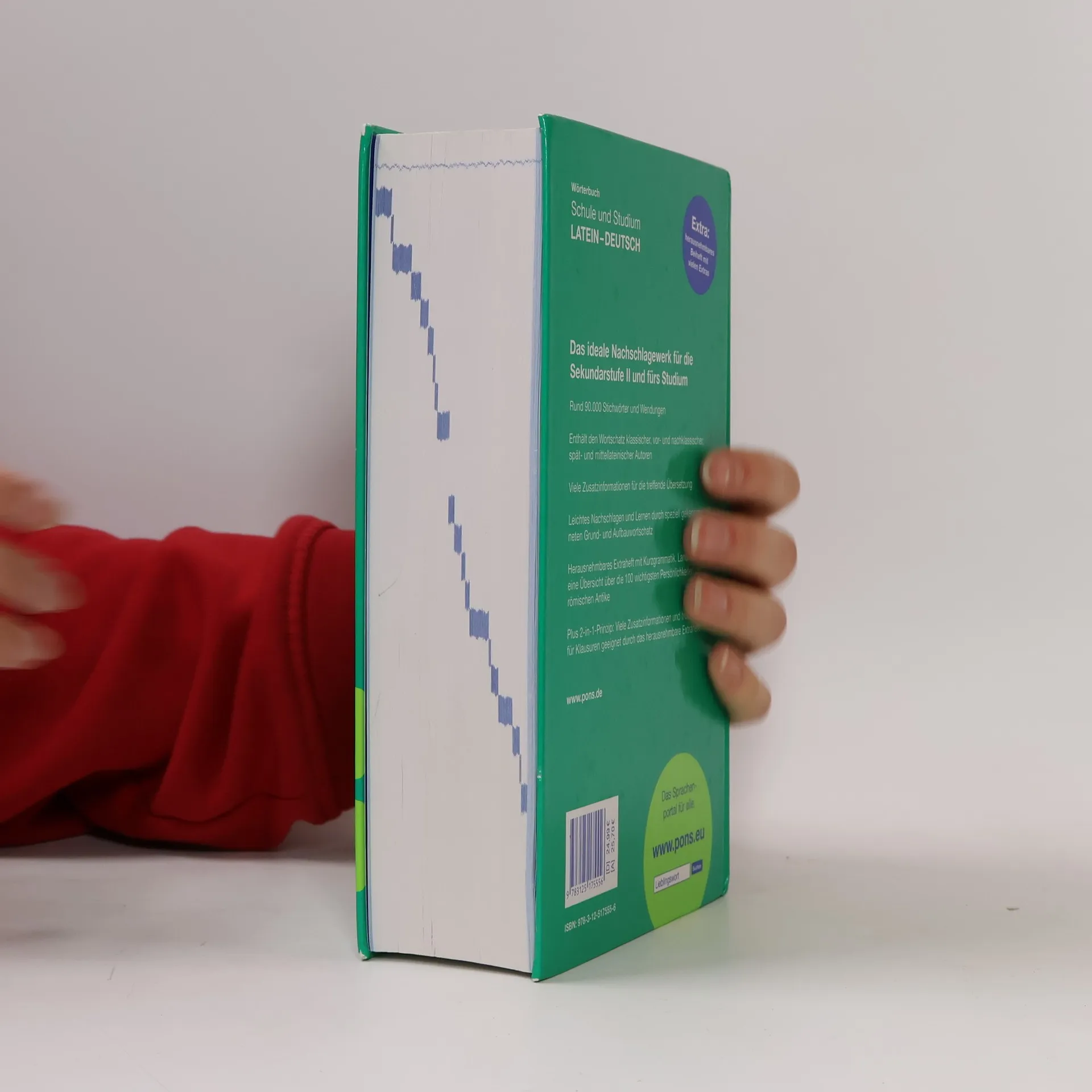 • Rund 90.000 Stichwörter und Wendungen • Enthält den Wortschatz klassischer, vor- und nachklassischer, spät- und mittellateinischer Autoren • Leichtes Lernen und Nachschlagen durch gekennzeichneten Grund und Aufbauwortschatz • Zitierform bei Verben ist die 1. Person Singular Präsens Aktiv bzw. Passiv • Kennzeichnung der langen Vokale • Beiheft enthält: Kurzgrammatik, die 100 wichtigsten Persönlichkeiten der römischen Antike, Landkarten