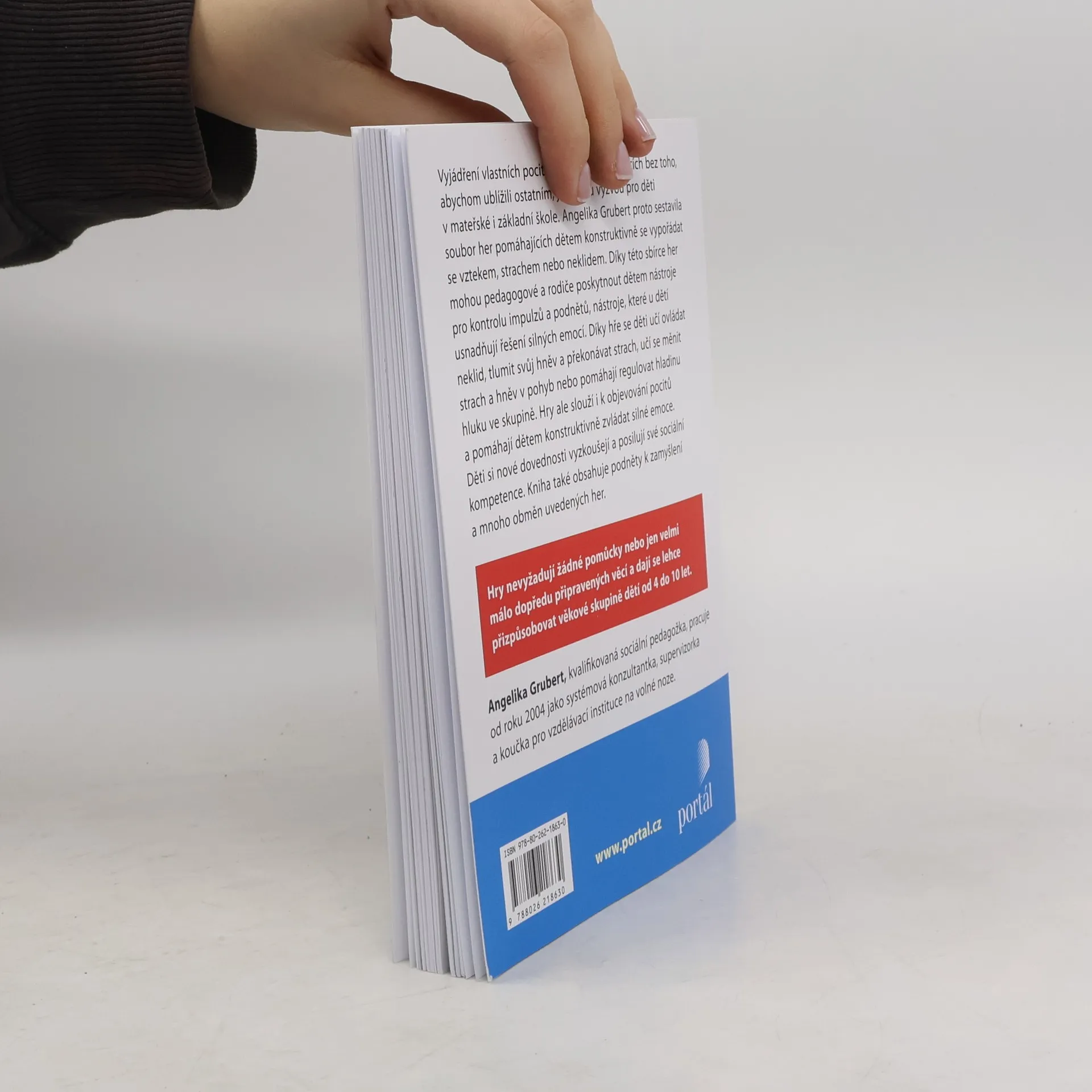 Vyjádření vlastních pocitů v konfliktních situacích bez toho, abychom ublížili ostatním, je velkou výzvou pro děti v mateřské i základní škole. Angelika Grubert proto sestavila tento soubor her pomáhající dětem konstruktivně se vypořádat se vztekem, strachem nebo neklidem. Díky této sbírce her mohou pedagogové, učitelé a rodiče poskytnout dětem nástroje pro kontrolu impulzů a podnětů, nástroje, které u dětí usnadňují řešení silných emocí. Prostřednictvím hry se děti učí ovládat neklid, tlumit svůj hněv a překonávat strach, učí se měnit strach a hněv v pohyb nebo pomáhají regulovat hladinu hluku ve skupině. Hry slouží ale i k objevování pocitů a pomáhají dětem konstruktivně zvládat silné emoce. Děti si své nové dovednosti vyzkouší a posilují své sociální kompetence. Kniha také obsahuje podněty k zamyšlení a uvedené hry v mnoha obměnách! Hry nevyžadují žádné nebo jen velmi málo dopředu připravených pomůcek a dají se lehce přizpůsobovat věkové skupině dětí od 4 do 10 let. Angelika Grubert, kvalifikovaná sociální pedagožka, pracuje od roku 2004 na volné noze jako systémová konzultantka, supervizorka a koučka pro vzdělávací instituce.
