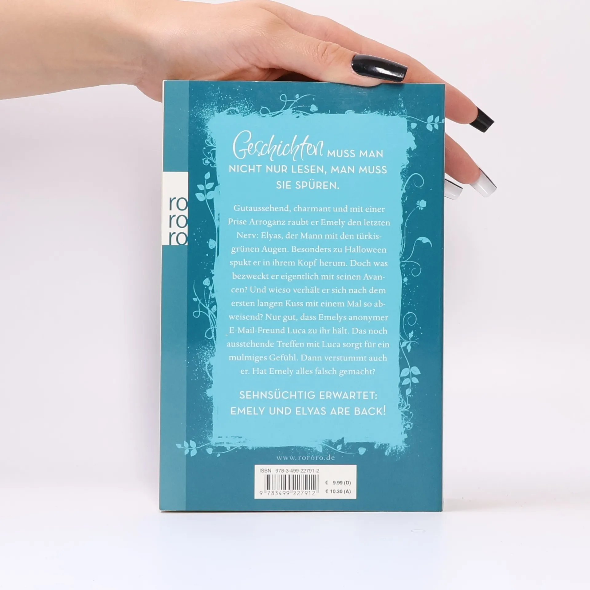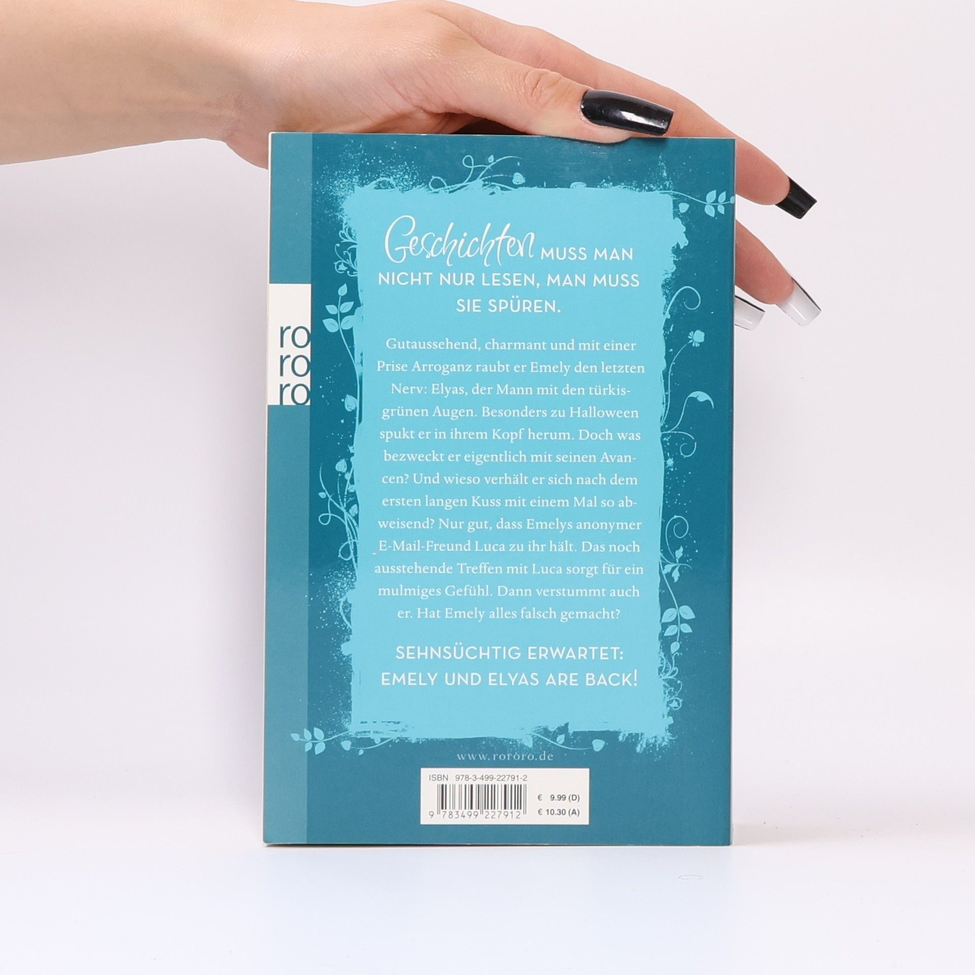 Gut aussehend, charmant und mit einer Prise Arroganz raubt er Emely den letzten Nerv: Elyas, der Mann mit den türkisgrünen Augen. Besonders zu Halloween spukt er in ihrem Kopf herum. Doch was bezweckt er eigentlich mit seinen Avancen? Und wieso verhält er sich nach dem ersten langen Kuss mit einem Mal so abweisend? Nur gut, dass Emelys anonymer E-Mail-Freund Luca zu ihr hält. Das noch ausstehende Treffen mit Luca sorgt für ein mulmiges Gefühl. Dann verstummt auch er. Hat Emely alles falsch gemacht?