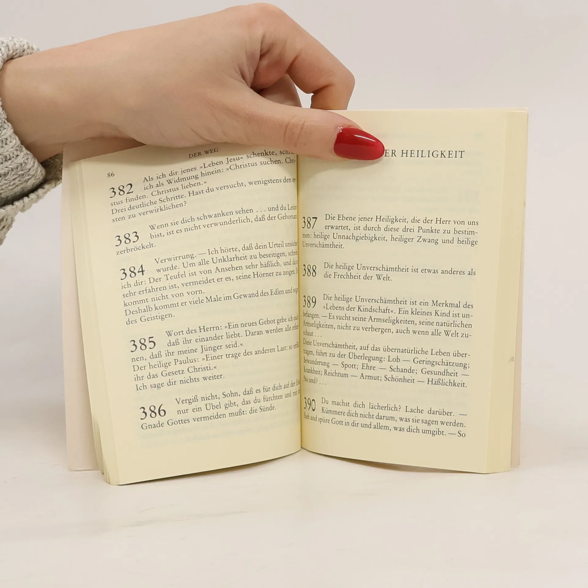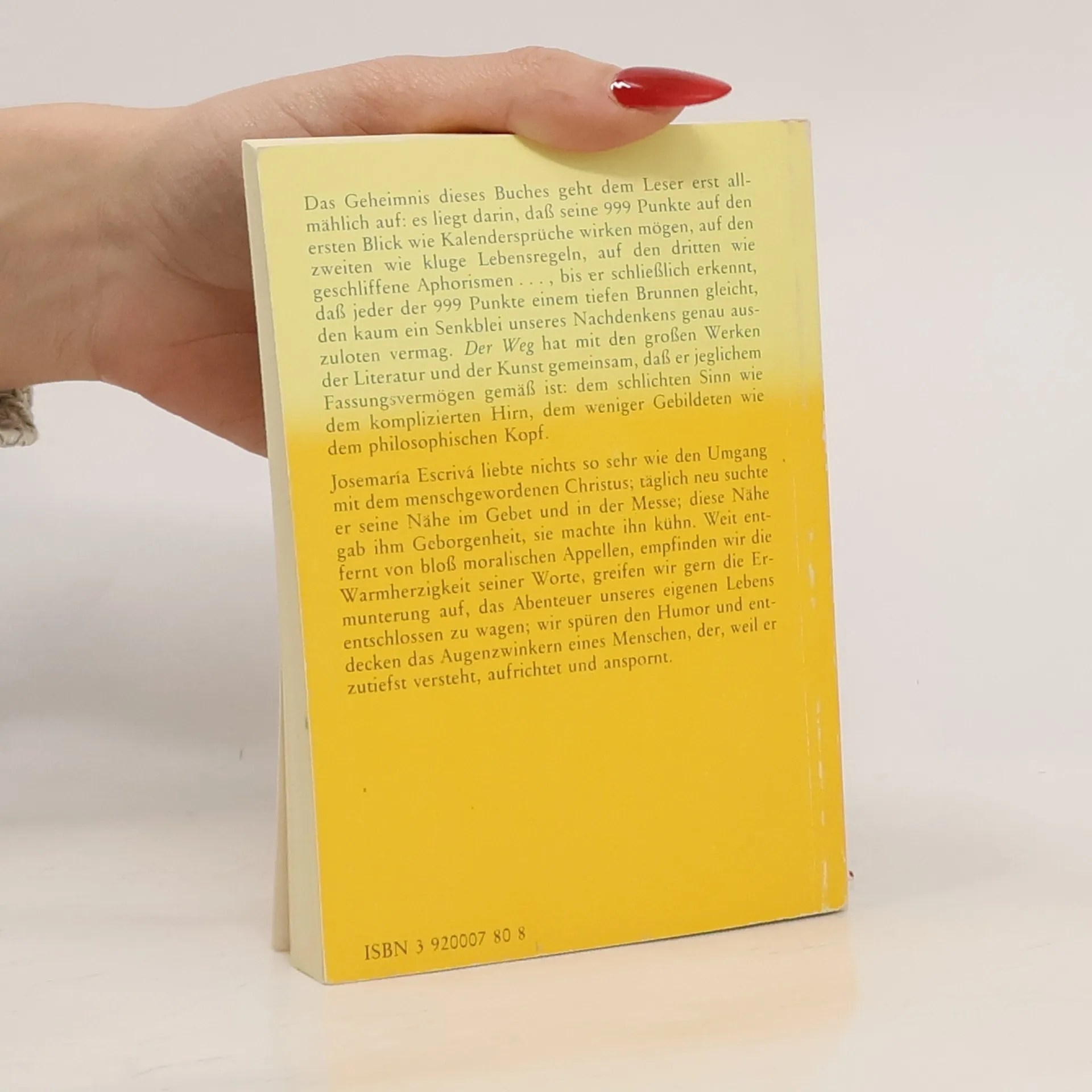 Ein geistlicher Klassiker: 999 aufruettelnde Maximen für ein Leben mit Gott. Das Erstlingswerk des heiligen Josemaría Escrivá beeindruckt durch seine unbefangene Sprache und wegweisenden Impulse. Die 999 Punkte erscheinen zunächst wie Kalendersprüche, dann wie kluge Lebensregeln und schließlich wie geschliffene Aphorismen. Bei näherer Betrachtung offenbart sich, dass jeder Punkt einem tiefen Brunnen gleicht, den es zu erkunden gilt. Das Werk spricht sowohl den schlichten Sinn als auch den komplizierten Geist an und ist für alle zugänglich, unabhängig von Bildung und Intellekt. Josemaría Escrivá suchte täglich die Nähe des menschgewordenen Christus im Gebet und in der Messe, was ihm Geborgenheit und Kühnheit verlieh. Seine Worte sind weit mehr als bloße moralische Appelle; sie strahlen Warmherzigkeit aus und ermutigen dazu, das eigene Leben entschlossen zu gestalten. Der Humor und das Augenzwinkern des Autors zeigen, dass er tiefes Verständnis für die menschliche Natur hat und dazu anregt, das Leben mit Begeisterung zu leben. Dieses Werk hat sich als moderner Klassiker der geistlichen Literatur etabliert und ist in über vier Millionen Exemplaren und 44 Sprachen weltweit verbreitet.