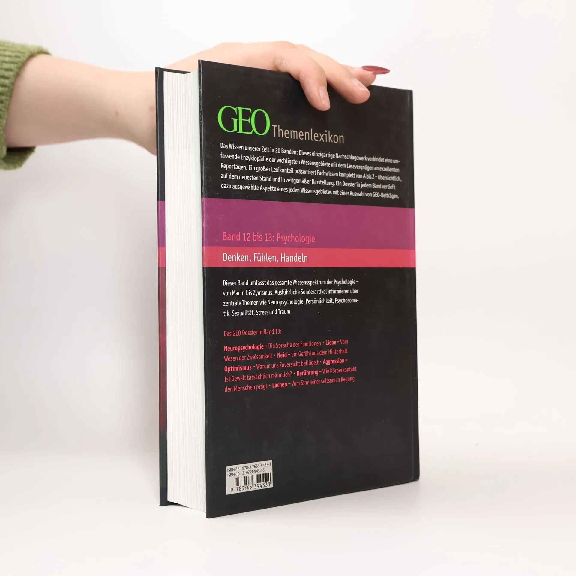 Das Wissen unserer Zeit in 20 Themenbänden: Dieses einzigartige und preisgünstige Nachschlagewerk ist eine Kooperation des Brockhaus-Verlages mit dem Wissenschaftsmagazin GEO und verbindet eine umfassende Enzyklopädie der wichtigsten Wissensgebiete mit dem Lesevergnügen an exzellenten Reportagen im GEO Dossier, das den alphabetischen Stichwortbestand eines jeden Bandes ergänzt. Die Bände 12 und 13 beschäftigen sich mit dem Themenbereich »Psychologie«.
