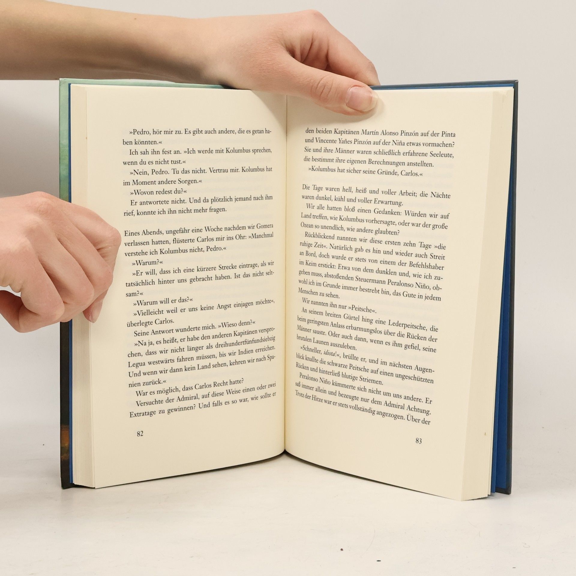 Der Mörder schlägt jedes Mal zu, wenn das Schiff vor Anker geht. Der junge Novize Pedro ist mit an Bord der Santa María, als Christoph Kolumbus 1492 den Seeweg nach Indien sucht. Doch nicht nur die Verbrechen überschatten das wagemutige Abenteuer zur See: Die Stimmung an Bord ist gereizt, die Mannschaft beginnt, den Glauben an Kolumbus? verwegenes Vorhaben zu verlieren. Längst hätten sie Indien erreichen müssen! Aber Pedro hält an Kolumbus fest. Und er ist entschlossen, die Verbrechen aufzuklären. Nacht für Nacht sitzt Pedro im Schein einer Kerze über seiner Pergamentrolle und dokumentiert alle Ereignisse des Tages. Die Route der Santa María, ungünstige Strömungen, die Stimmung an Bord, Gefahren, Hoffnungen ? und die Hinweise auf den Mörder. Pedro ist ihm auf der Spur. Er glaubt, ihn zu kennen. Doch Pedro verdächtigt den Falschen.