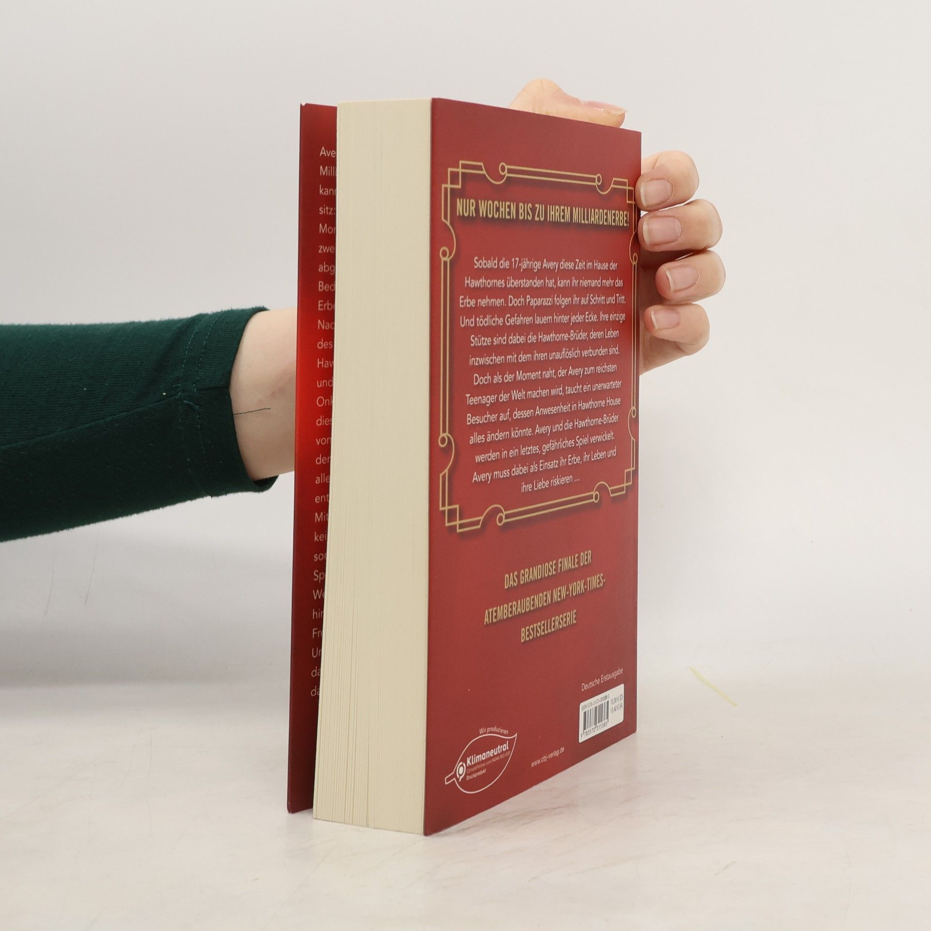 Eine Erbin im Fadenkreuz – Eine mörderische Mission – Ein riskantes Spiel Das einzige, was die 17-jährige Avery von ihrem Milliardenerbe trennt, sind noch einige Wochen, die sie im Hause der Hawthornes überstehen muss. Aber Paparazzi folgen ihr auf Schritt und Tritt. Und tödliche Gefahren lauern hinter jeder Ecke. Ihre einzige Stütze sind dabei die Hawthorne-Brüder, deren Leben inzwischen mit dem ihren unauflöslich verbunden sind. Doch als der Moment naht, der Avery zum reichsten Teenager der Welt machen wird, taucht ein unerwarteter Besucher auf, der ihre Hilfe braucht – und dessen Anwesenheit in Hawthorne House alles ändern könnte. Avery und die Hawthorne-Brüder werden in ein letztes, gefährliches Spiel verwickelt, von einem unbekannten und mächtigen Gegenspieler. Avery muss dabei als Einsatz ihr Erbe, ihr Leben und ihre Liebe riskieren ... Das grandiose Finale der atemberaubenden New-York-Times-Bestsellerserie. Die »Inheritance Games«-Reihe: Inheritance Games (Band 1) Inheritance Games – Das Spiel geht weiter (Band 2) Inheritance Games – Der letzte Schachzug (Band 3)