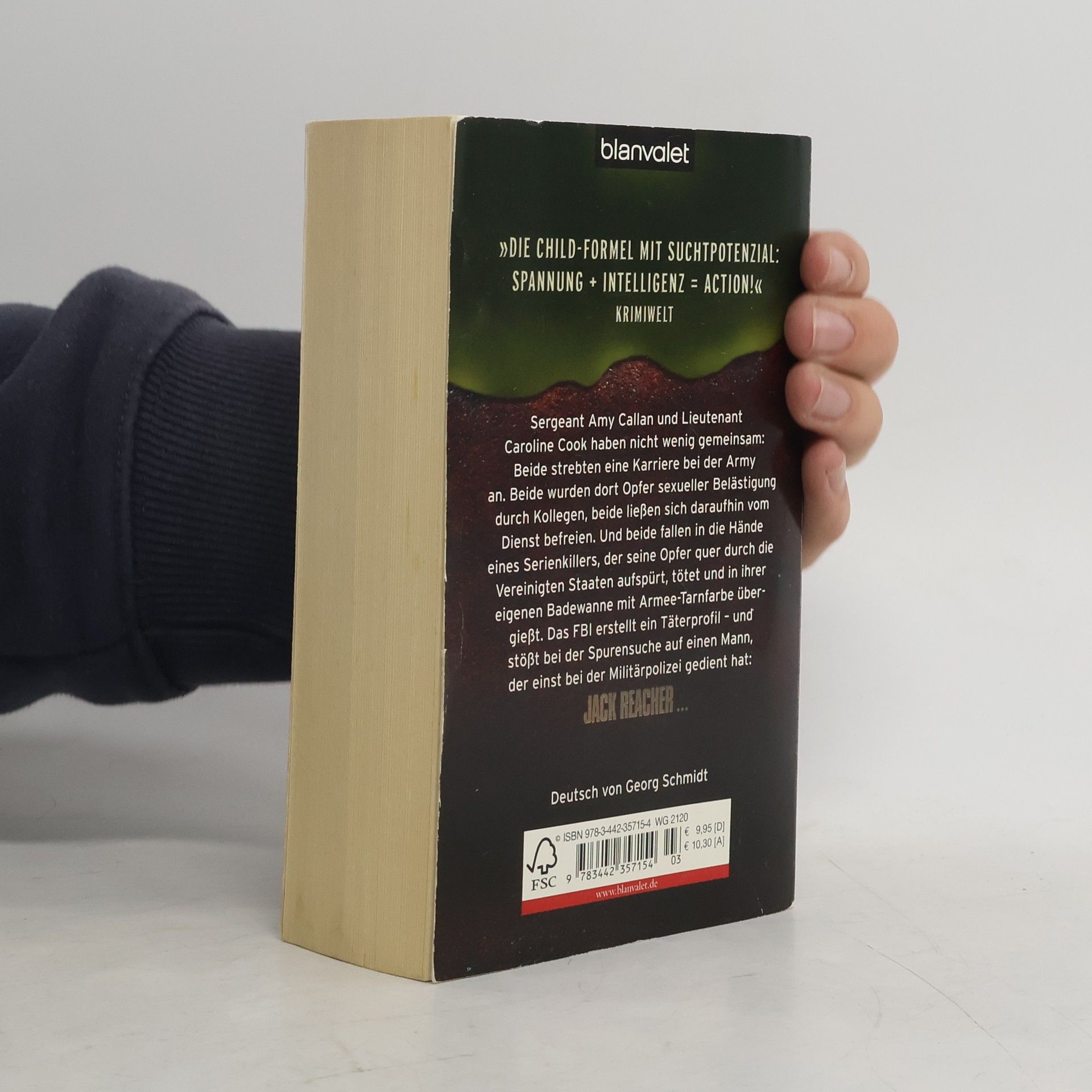 Sergeant Amy Callan und Lieutenant Caroline Cook haben einiges gemeinsam. Beide wollten Karriere bei der Armee machen, beide waren Opfer sexueller Belästigung durch Kollegen, beide ließen sich anschließend vom Dienst suspendieren – und beide sind jetzt tot. Wiederum in Übereinstimmung wurden sie beide in ihrer eigenen Badewanne aufgefunden, in Armee-Tarnfarbe schwimmend, die Leichen scheinbar völlig unberührt und ohne ein einziges Anzeichen für die Todesursache. Hochrangige Profiler des FBI beginnen fieberhaft die Jagd nach einem Serienmörder: einem Angehörigen der Armee, einem hochintelligenten, einsamen, unbarmherzigen Mann, der beide Frauen kannte – und wahrscheinlich noch ein paar weitere, auf die Amys und Carolines Opferprofil ebenfalls zutrifft. Auf Jack Reacher, einen ehemaligen Spitzen-Ermittler der Militärpolizei, passen diese Merkmale auffallend perfekt. Das FBI kreist ihn ein, muss aber rasch erkennen, daß er nicht der Täter ist - sondern vielmehr der einzige, der bei der Lösung dieses scheinbar unlösbaren Falles helfen kann. Doch Reacher hat nicht die Absicht, sich vor den Karren des FBI spannen zu lassen... Jack Reacher greift ein, wenn andere wegschauen, und begeistert so seit Jahren Millionen von Lesern. Lassen Sie sich seine anderen Fälle nicht entgehen. Alle Bücher können unabhängig voneinander gelesen werden.