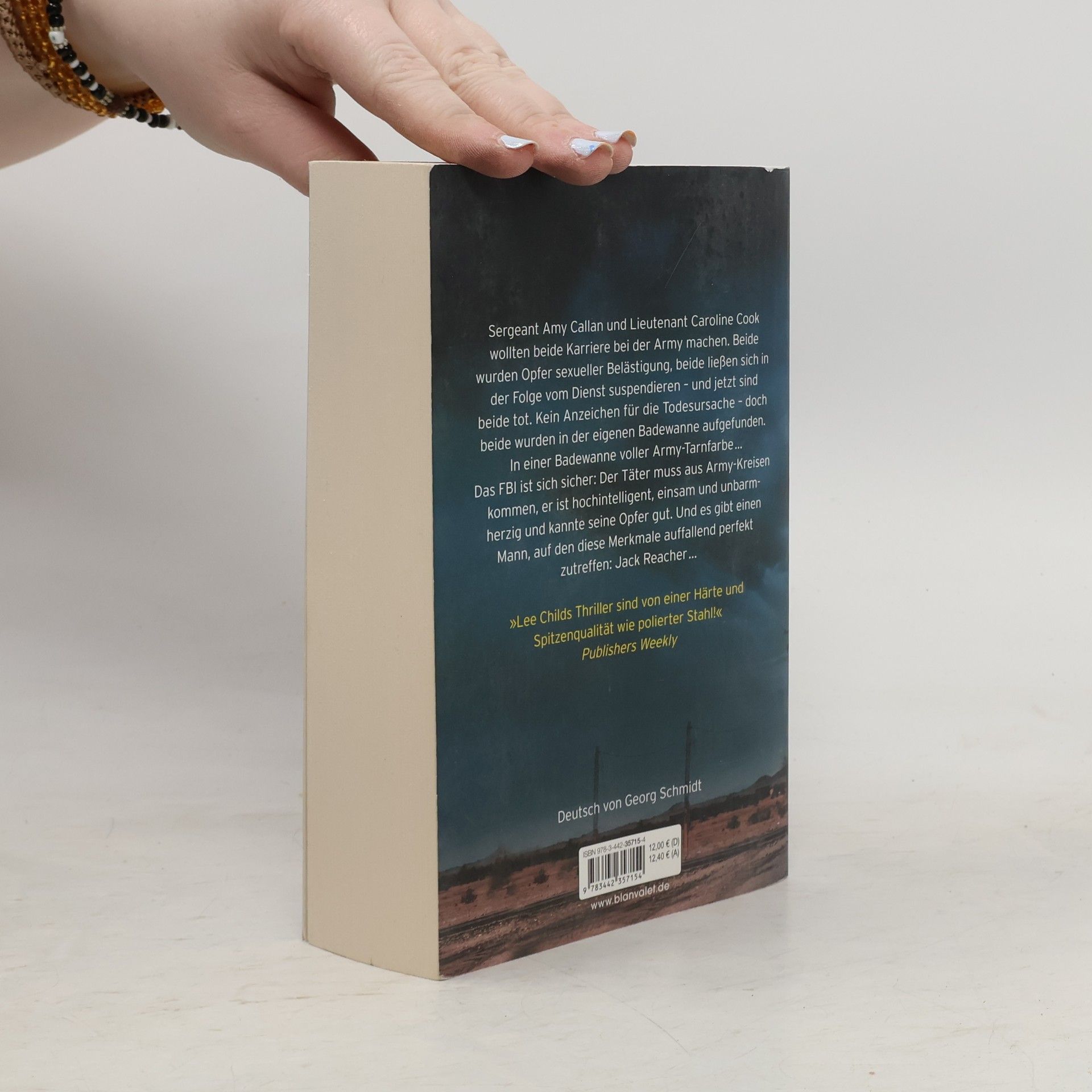 Sergeant Amy Callan und Lieutenant Caroline Cook haben einiges gemeinsam. Beide wollten Karriere bei der Armee machen, beide waren Opfer sexueller Belästigung durch Kollegen, beide ließen sich anschließend vom Dienst suspendieren – und beide sind jetzt tot. Wiederum in Übereinstimmung wurden sie beide in ihrer eigenen Badewanne aufgefunden, in Armee-Tarnfarbe schwimmend, die Leichen scheinbar völlig unberührt und ohne ein einziges Anzeichen für die Todesursache. Hochrangige Profiler des FBI beginnen fieberhaft die Jagd nach einem Serienmörder: einem Angehörigen der Armee, einem hochintelligenten, einsamen, unbarmherzigen Mann, der beide Frauen kannte – und wahrscheinlich noch ein paar weitere, auf die Amys und Carolines Opferprofil ebenfalls zutrifft. Auf Jack Reacher, einen ehemaligen Spitzen-Ermittler der Militärpolizei, passen diese Merkmale auffallend perfekt. Das FBI kreist ihn ein, muss aber rasch erkennen, daß er nicht der Täter ist - sondern vielmehr der einzige, der bei der Lösung dieses scheinbar unlösbaren Falles helfen kann. Doch Reacher hat nicht die Absicht, sich vor den Karren des FBI spannen zu lassen... Jack Reacher greift ein, wenn andere wegschauen, und begeistert so seit Jahren Millionen von Lesern. Lassen Sie sich seine anderen Fälle nicht entgehen. Alle Bücher können unabhängig voneinander gelesen werden.