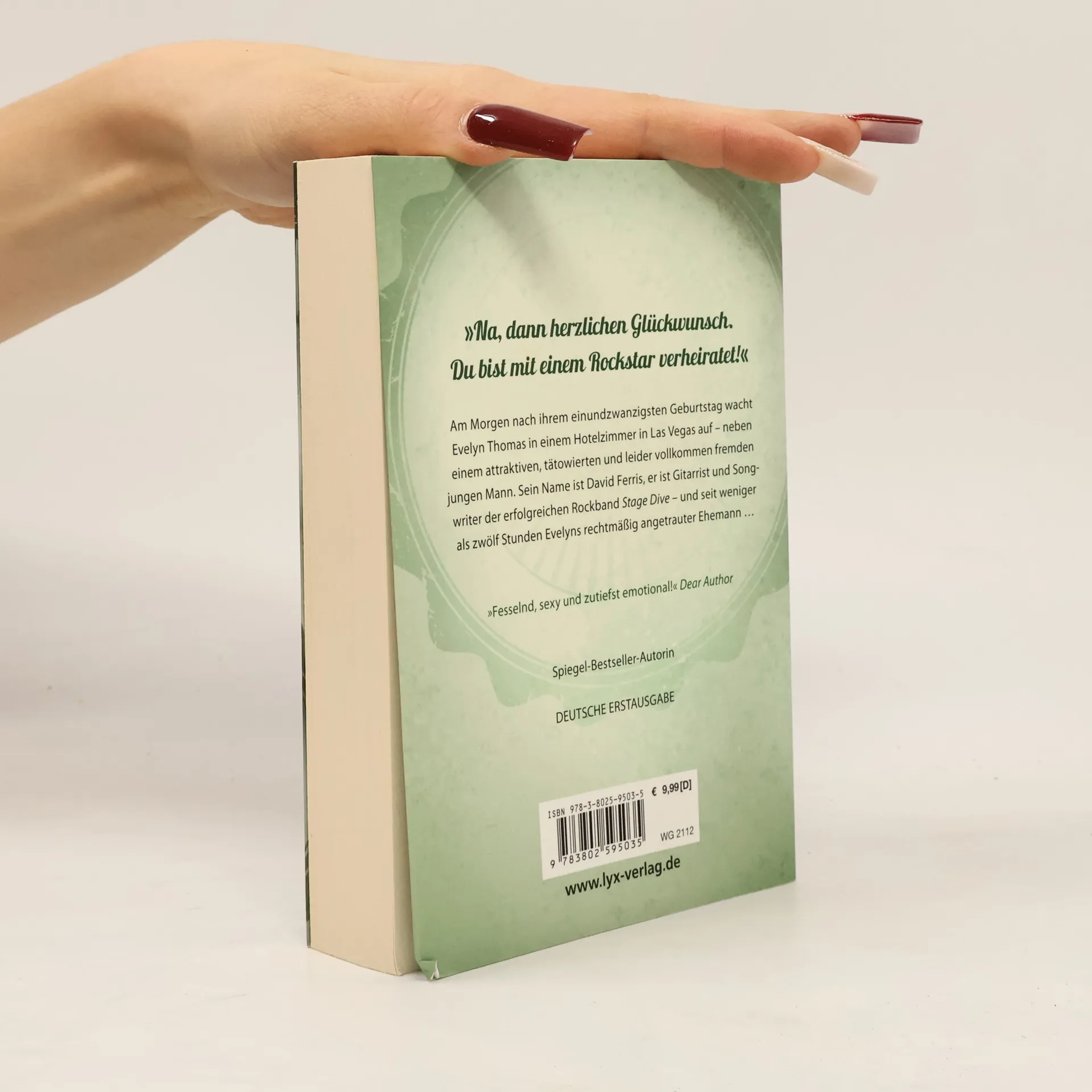 Am Morgen nach ihrem einundzwanzigsten Geburtstag wacht Evelyn Thomas in einem Hotelzimmer in Las Vegas auf – neben einem sehr attraktiven, tätowierten und leider vollkommen fremden jungen Mann. Sein Name ist David, und er ist Gitarrist der erfolgreichen Rockband “Stage Dive” … und seit weniger als zwölf Stunden Evelyns Ehemann. Die beiden müssen sich entscheiden, ob sie einander den Rücken kehren wollen oder ob da vielleicht doch mehr zwischen ihnen ist …