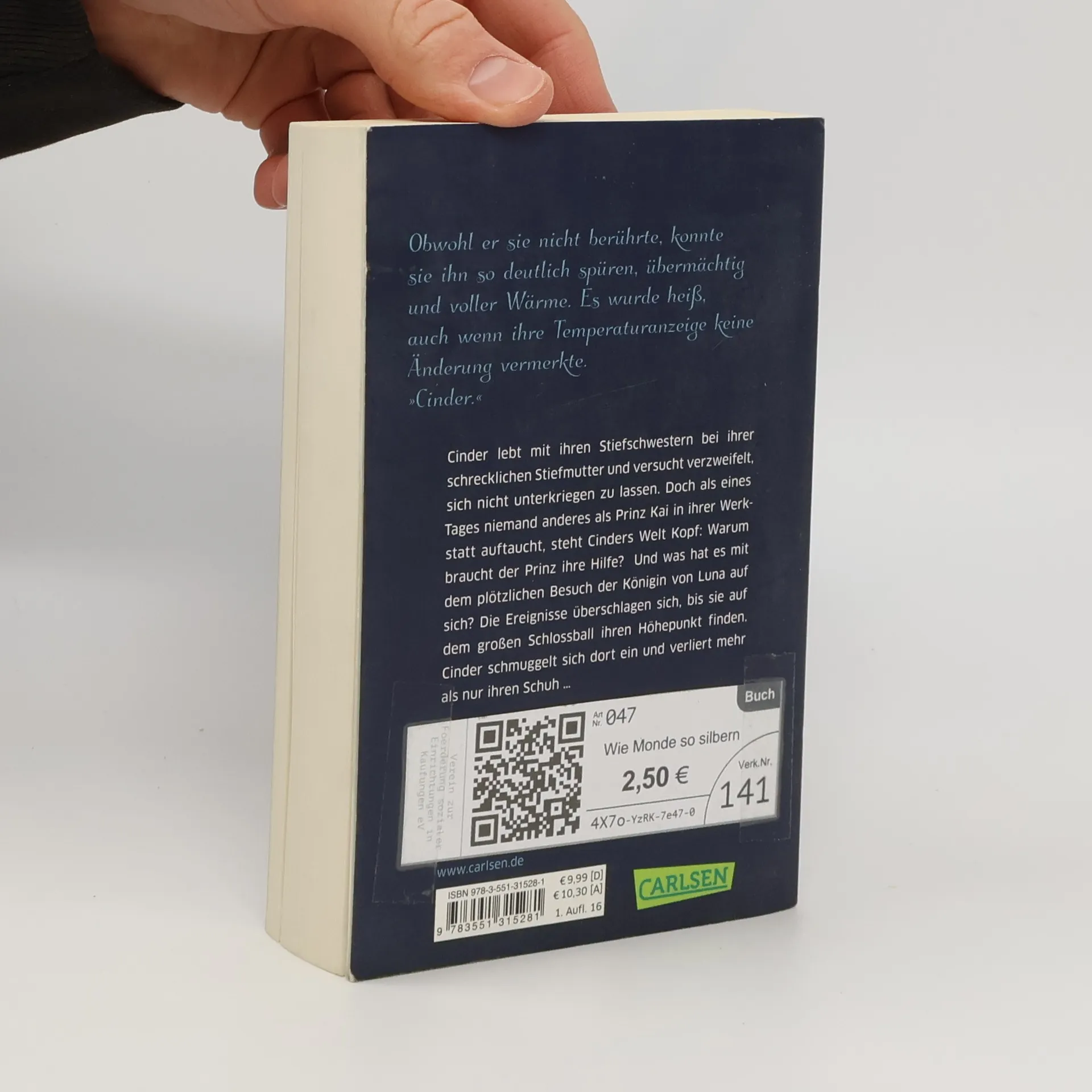 Cinder lebt mit ihren Stiefschwestern bei ihrer schrecklichen Stiefmutter und versucht verzweifelt, sich nicht unterkriegen zu lassen. Doch als eines Tages niemand anderes als Prinz Kai in ihrer Werkstatt auftaucht, steht Cinders Welt Kopf: Warum braucht der Prinz ihre Hilfe? Und was hat es mit dem plötzlichen Besuch der Königin von Luna auf sich? Die Ereignisse überschlagen sich, bis sie auf dem großen Schlossball ihren Höhepunkt finden. Cinder schmuggelt sich dort ein und verliert mehr als nur ihren Schuh … Alle Bände der faszinierenden Luna-Chroniken: Wie Monde so silbern (Band 1) Wie Blut so rot (Band 2) Wie Sterne so golden (Band 3) Wie Schnee so weiß (Band 4)