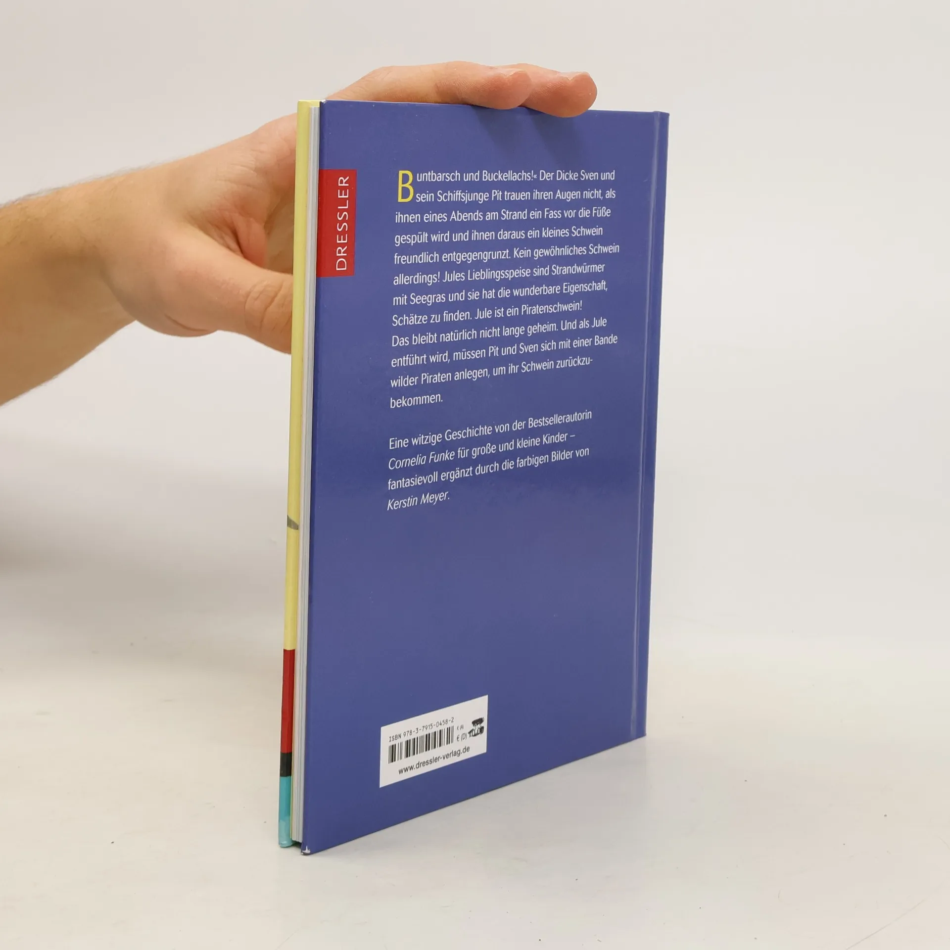 „Buntbarsch und Buckellachs!“ Der Dicke Sven und sein Schiffsjunge Pit trauen ihren Augen nicht, als ihnen eines Abends am Strand ein Fass vor die Füße gespült wird und ihnen daraus ein kleines Schwein freundlich entgegengrunzt. Kein gewöhnliches Schwein allerdings! Jules Lieblingsspeise sind Strandwürmer mit Seegras und sie hat die wunderbare Eigenschaft, Schätze zu finden. Jule ist ein Piratenschwein! Das bleibt natürlich nicht lange geheim. Und als Jule entführt wird, müssen Pit und Sven sich mit einer Bande wilder Piraten anlegen, um ihr Schwein zurückzubekommen. Von gutmütigen Seebären, hinterlistigen Piraten und unglaublichen Schätzen handelt diese - für große und kleine Kinder gleichermaßen geeignete - turbulente Geschichte der Bestsellerautorin Cornelia Funke. Durchgehend farbig illustriert von Kerstin Meyer.