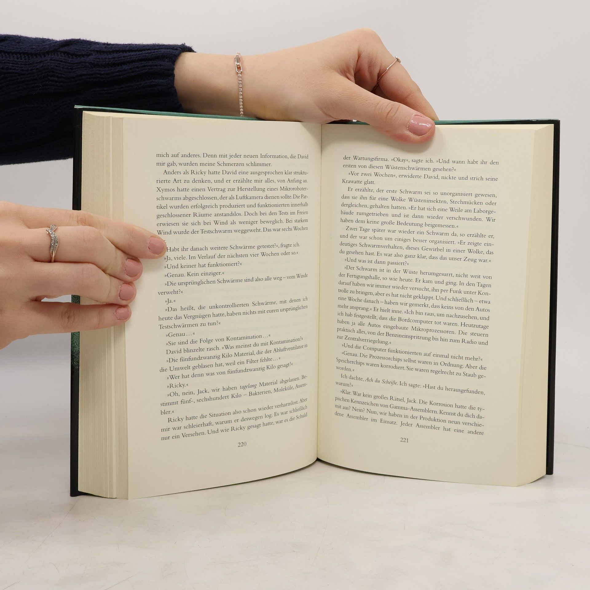 Der Biotechnologe Jack steigt aus dem Helikopter, die flirrende Hitze nimmt ihm schier den Atem. Vor ihm liegt mitten in der Wüste von Nevada die Forschungsstation der Firma Xymos. Das weltweit agierende Nanotechnologie-Unternehmen stellt im Auftrag des Pentagons Miniaturkameras für die Kriegsführung her, die auf der Struktur von Bakterien aufbauen. Aber dem Forscherteam ist bei der Produktion ein folgenreicher Fehler unterlaufen. Über Wochen hinweg entwichen mutierte Mikroroboter aus dem Labor durch ein nur unzureichend abgedichtetes Lüftungsrohr in die Wüste. Jack, der das Computerprogramm entwickelt hat, mit dem Xymos arbeitet, soll retten, was noch zu retten ist. Denn die Partikel lassen sich nicht mehr kontrollieren. Sie finden sich zu einem Schwarm zusammen, der in immer neuen Kampfformationen zunächst nur Kaninchen und Kojoten, schließlich auch Menschen jagt, sie tötet oder ? schlimmer noch ? in ihnen weiterlebt und nach und nach alle Zellen ersetzt! Mit der Zeit erkennt Jack, dass die Forscher seinen Kampf gegen die Killerwolke zu behindern versuchen. Warum nur ignorieren seine vermeintlichen Mitstreiter die Tragweite des Produktionsfehlers? Langsam dämmert ihm die furchtbare Wahrheit.
