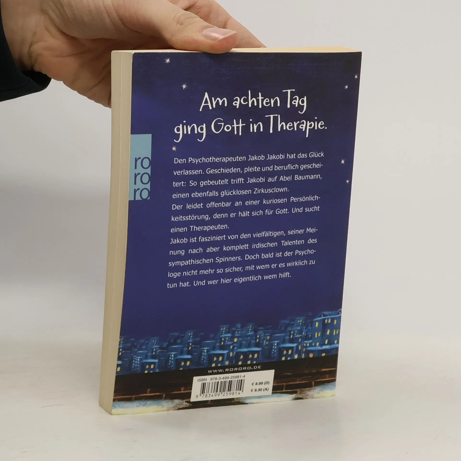 Am achten Tag ging Gott in Therapie Den Psychotherapeuten Jakob Jakobi hat das Glück verlassen. Geschieden, pleite und beruflich gescheitert: So gebeutelt trifft Jakobi auf Abel Baumann, einen ebenfalls glücklosen Zirkusclown.Der leidet offenbar an einer kuriosen Persönlichkeitsstörung, denn er hält sich für Gott. Und sucht einen Therapeuten. Jakob ist fasziniert von den vielfältigen, seiner Meinung nach aber komplett irdischen Talenten des sympathischen Spinners. Doch bald ist der Psychologe nicht mehr so sicher, mit wem er es wirklich zu tun hat. Und wer hier eigentlich wem hilft.