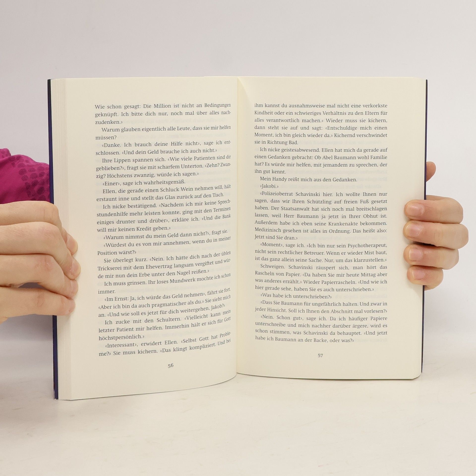«Vor Ihnen sitzt der liebe Gott höchstpersönlich», erklärt mein Gegenüber und wischt sich die Lachtränen aus dem Gesicht.Wir schweigen.«Witzig», sage ich nach einer Weile und gebe mich unbeeindruckt. «Ich hab Sie mir immer anders vorgestellt.»Baumann hebt den Zeigefinger und sagt mit gespielter Strenge: «Das ist verboten. Man darf sich kein Bild von mir machen.»«Na, immerhin scheint Gott Humor zu haben», sage ich.Baumann nickt. «Es bleibt Gott nichts anderes übrig, als die Dinge mit Humor zu nehmen.» Sein Lächeln verwandelt sich in einen Anflug von Melancholie. Nachdenklich schaut er zu Boden. «Es ist die Wahrheit, Dr. Jakobi. Ich bin es wirklich.» Er beugt sich vor und sieht mir nun direkt in die Augen. «Ich bin Gott. Und ich bin, unter uns gesagt, ziemlich im Arsch. Es wäre also schön, wenn Sie mir helfen könnten, Doktor.»