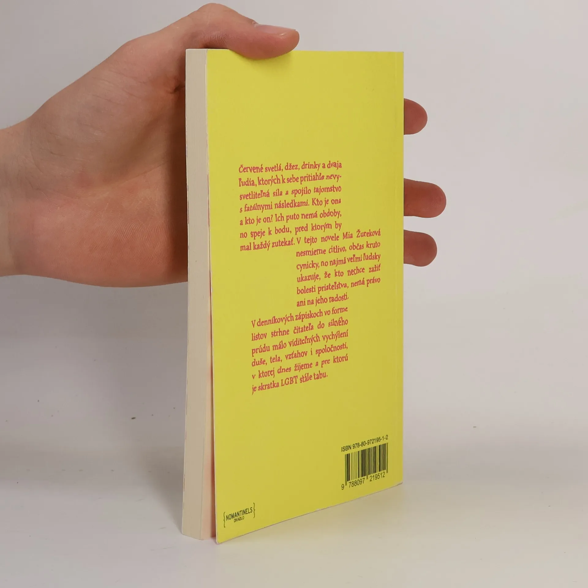 Červené svetlá, džez, drinky a dvaja ľudia, ktorých k sebe pritiahla nevysvetliteľná sila a spojilo tajomstvo s fatálnymi následkami. Kto je ona a kto je on? Ich puto nemá obdoby, no speje k bodu, pred ktorým by mal každý zutekať. V tejto novele však Mia Žureková nesmierne citlivo, občas kruto cynicky, no najmä veľmi ľudsky ukazuje, že kto nechce zažiť bolesti priateľstva, nemá právo ani na jeho radosti. V denníkových zápiskoch vo forme listov okamžite strhne čitateľa do silného prúdu málo viditeľných vychýlení duše, tela, vzťahov i spoločnosti, v ktorej dnes žijeme a pre ktorú je skratka LGBT niekedy ešte stále tabu.