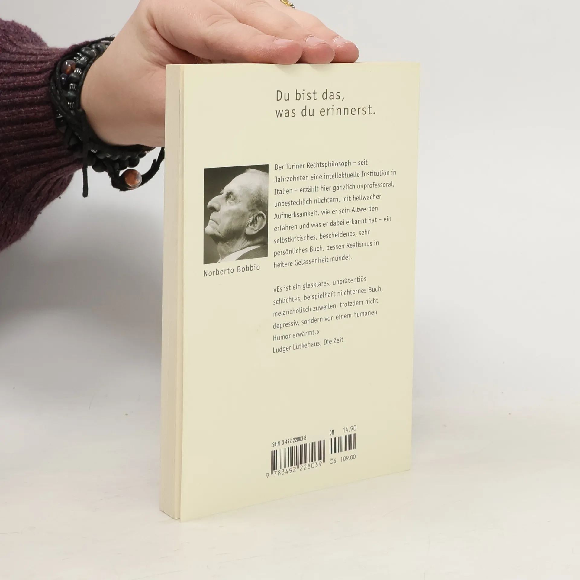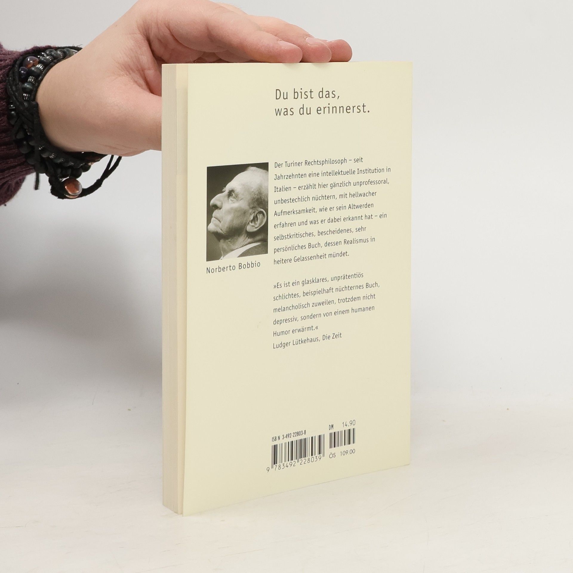 Die historische Krise der Jahre um 1990 hatte Norberto Bobbio »wie viele meiner Generation fassungslos zurückgelassen« und ihm sein Alter deutlich gemacht. Dieses Alter beschreibt er unnachahmlich kühl: Ausgrenzung aus der Gesellschaft, Leben in der Erinnerung, Bewusstsein für das Unerreichte, Verlangsamung. Und immer wieder die Frage: Wie ist es einem gelungen, all den Autos, Dachziegeln, Blitzen und Krankheiten auszuweichen und ein hohes Alter zu erreichen? Wie tief wird der Brunnen des Gedächtnisses? Wie soll man Grenzen akzeptieren, ohne sie zu erkennen? Wie geht man mit dem Reichtum der Vergangenheit um, wie mit dem Gefühl, nur an den Fuß des Wissens gekommen zu sein, wie mit der Erkenntnis, jeden Tag mehr aus der technischen Welt herauszufallen; und wie mit den eigenen Irrtümern und falschen Prognosen?