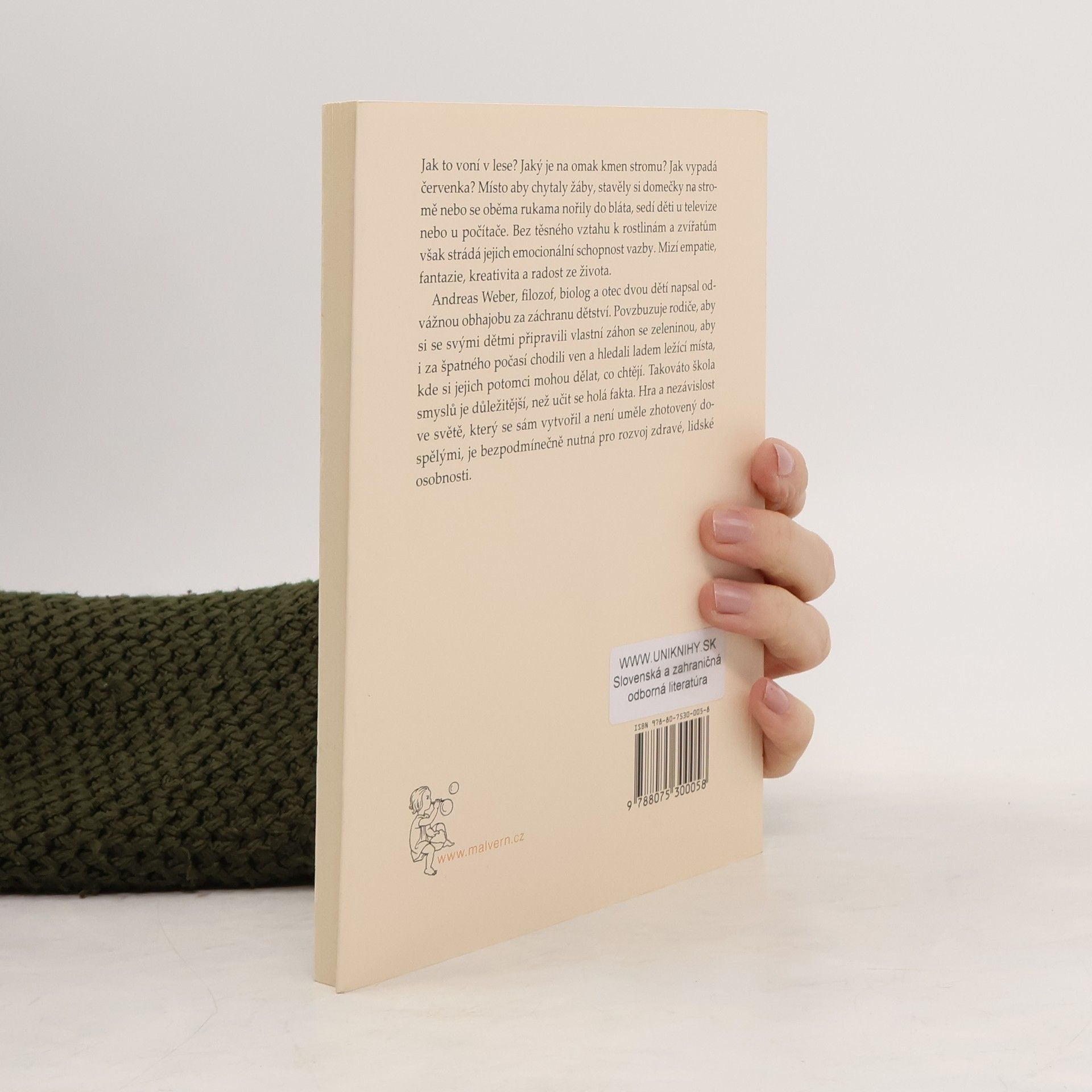 Jak to voní v lese? Jaký je na omak kmen stromu? Jak vypadá červenka? Místo aby chytaly žáby, stavěly si domečky na stromě nebo se oběma rukama nořily do bláta, sedí děti u televize nebo u počítače. Bez těsného vztahu k rostlinám a zvířatům však strádá jejich emocionální schopnost vazby. Mizí empatie, fantazie, kreativita a radost ze života. Andreas Weber, filozof, biolog a otec dvou dětí napsal odvážnou obhajobu za záchranu dětství. Povzbuzuje rodiče, aby si se svými dětmi připravili vlastní záhon se zeleninou, aby i za špatného počasí chodili ven a hledali ladem ležící místa, kde si jejich potomci mohou dělat, co chtějí. Takováto škola smyslů je důležitější, než učit se holá fakta. Hra a nezávislost ve světě, který se sám vytvořil a není uměle zhotovený dospělými, je bezpodmínečně nutná pro rozvoj zdravé, lidské osobnosti.