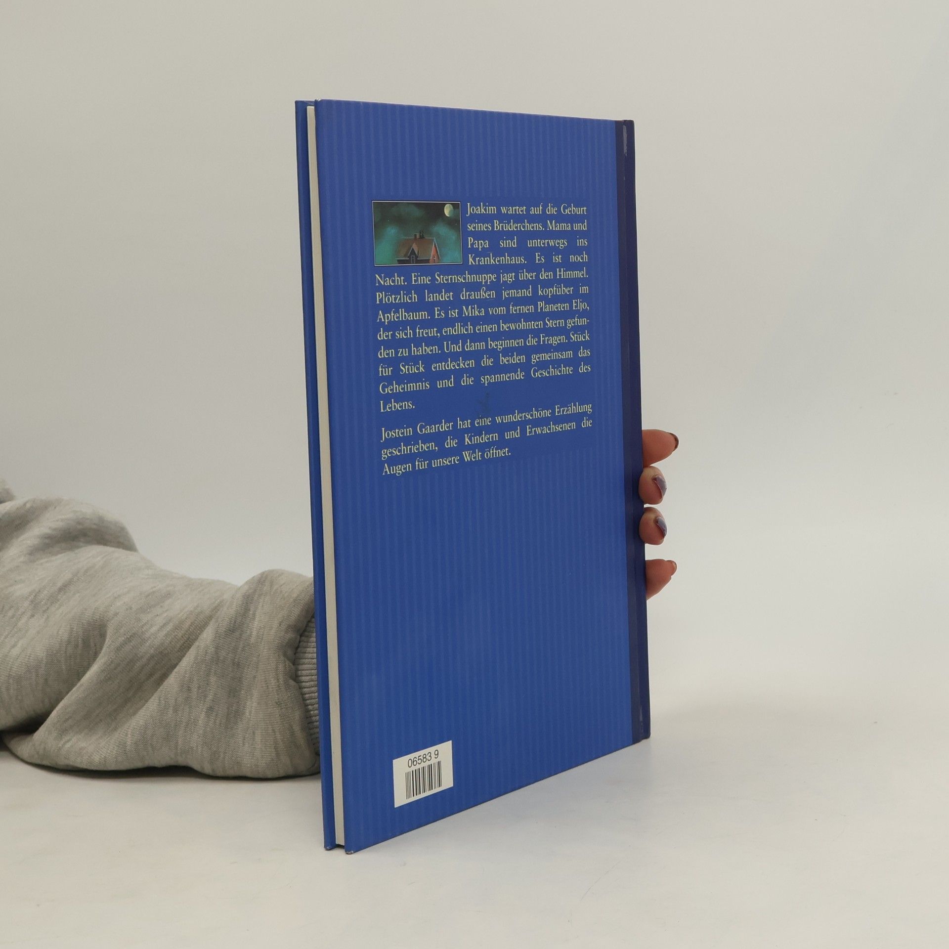 Es ist Nacht. Joakim ist allein zu Haus; die Eltern sind ins Krankenhaus gefahren, weil Joakim ein Brüderchen bekommen wird. Da jagt eine Sternschnuppe über den Himmel und Mika vom fernen Planeten Eljo landet kopfüber im Apfelbaum. Und damit beginnen die Schwierigkeiten. Wenn Joakim etwas erklärt, versteht ihn Mika nicht. So kommt es von einer Frage zu nächsten, und langsam begreifen die beiden, woher alles Leben auf der Welt kommt und wie es sich entwickelt hat. Gemeinsam tauchen sie immer tiefer ein in die spannende Geschichte des Lebens. Jostein Gaarders erstes Kinderbuch. Für Kinder, die gern viele Fragen stellen und Antworten wollen, mit denen sie etwas anfangen können. Eine ganz besondere Geschichte vom In-Die-Welt-Kommen. Mit Illustrationen von Henriette Sauvant.