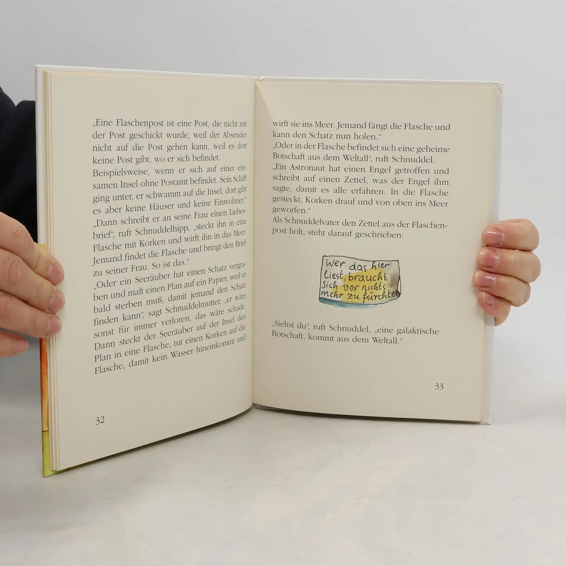 Schnuddel ist ein sehr kleiner Kerl. Aber er braucht sich vor nichts zu fürchten, weil er nämlich einen Hut hat, der ihn behütet und eine Botschaft, die ihm Kraft gibt. Obendrein bekommt er noch von seinem Freund Kanari eine Feder für seinen Hut. Das macht ihn lustig. Lustig sein und Kraft haben, etwas Besseres gibt es nicht auf der Welt, da kann man gut schlafen.