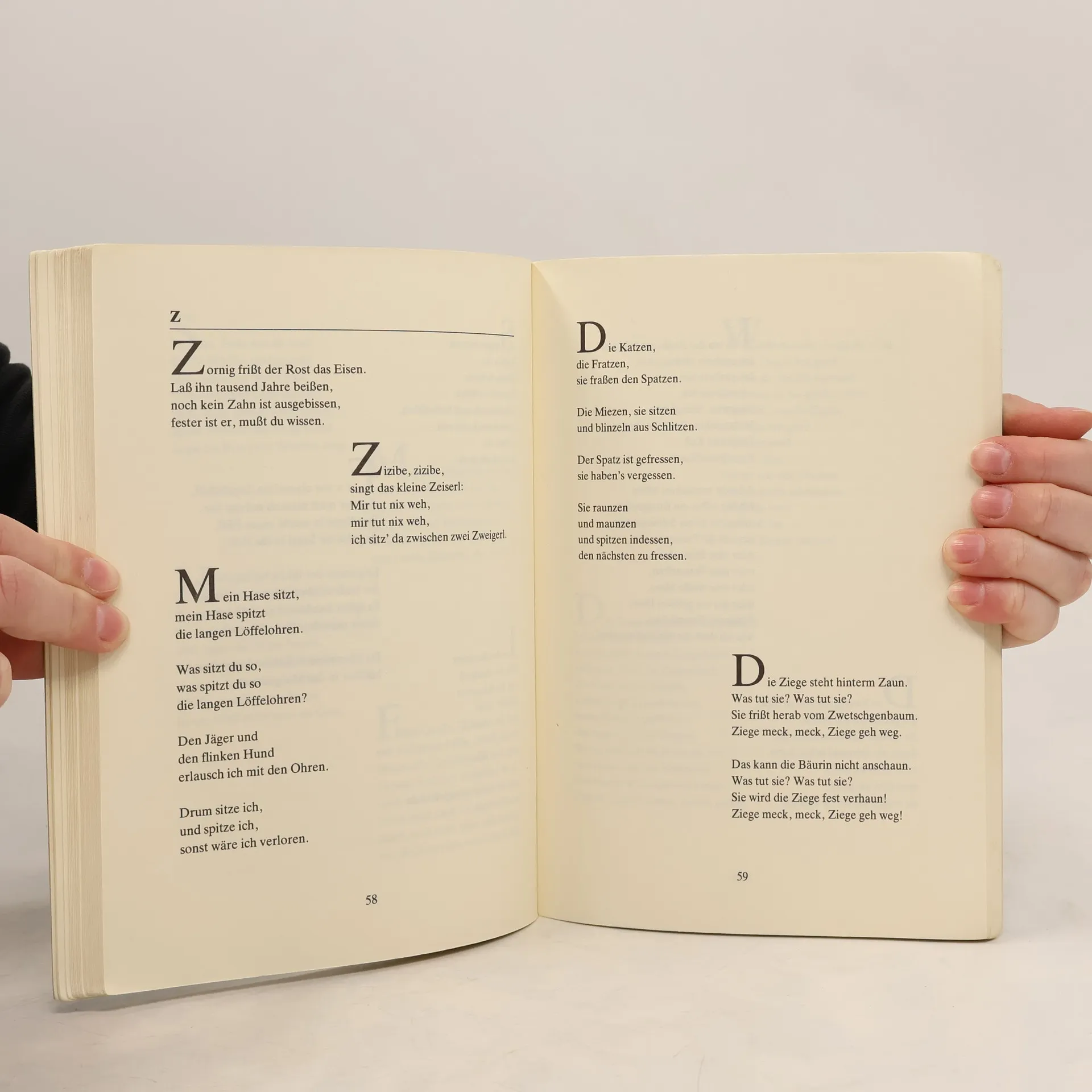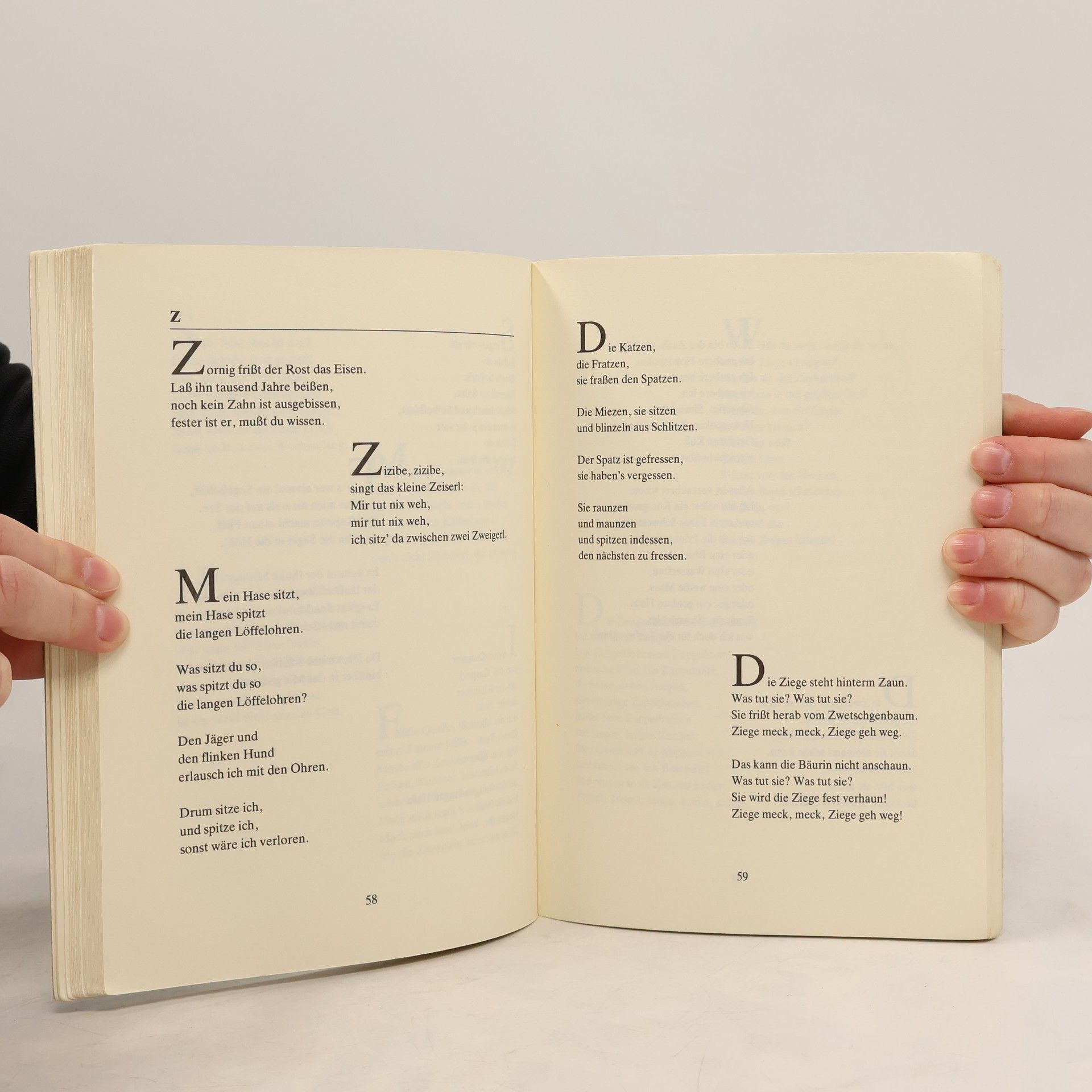 Die Sprache ist das Wertvollste was man den Kindern auf den Lebensweg mitgeben kann. Die hier gesammelten Gedichte und Sprüche sind für Kinder von 3–10 Jahren geeignet, für die Familie als auch im professionellen, pädagogischen Bereich. Im Anhang sind viele Verse mit Noten abgedruckt, so wird aus einfachen Versen ein Lied, das Freude bereitet und das musische Empfinden der Kinder unterstützt. Ritsch, -ratsch, sagt die Schere, bei meiner Ehre, ich habe geschitten. Recht schlecht, sagt der Zwirn, da braucht man mehr Hirn und das geht dir aus. Rasch, sagt die Nadel, bist du mit dem Tadel! Ich möchte sehr bitten! Ruhig, sagt das Leinen. Ich dulde keinen Streit hier im Haus. Aus.