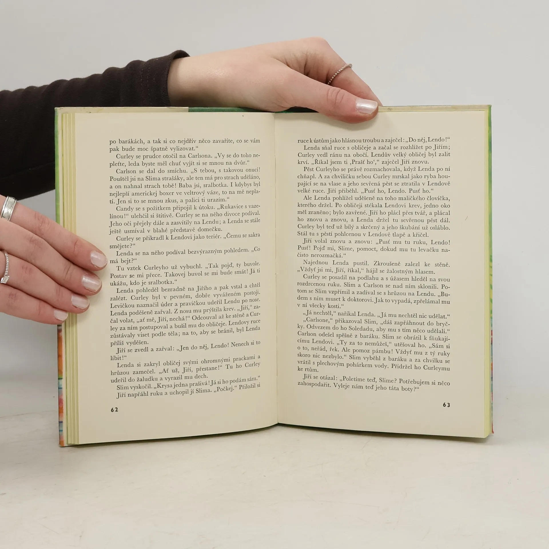 Proslulá novela známého amerického autora líčí baladický příběh dvojice potulných zemědělských dělníků, jejich sen o malém hospodářství, na které si chtějí vydělat a ušetřit nádenickou prací na ranči, a tragické ztroskotání. Doslov „Trojí zastavení Johna Steinbecka u lidíkočovných“ napsal Vladimír Vendyš. Typografie Zdenek Seydl. Odpovědná redaktorka Eva Ruxová.