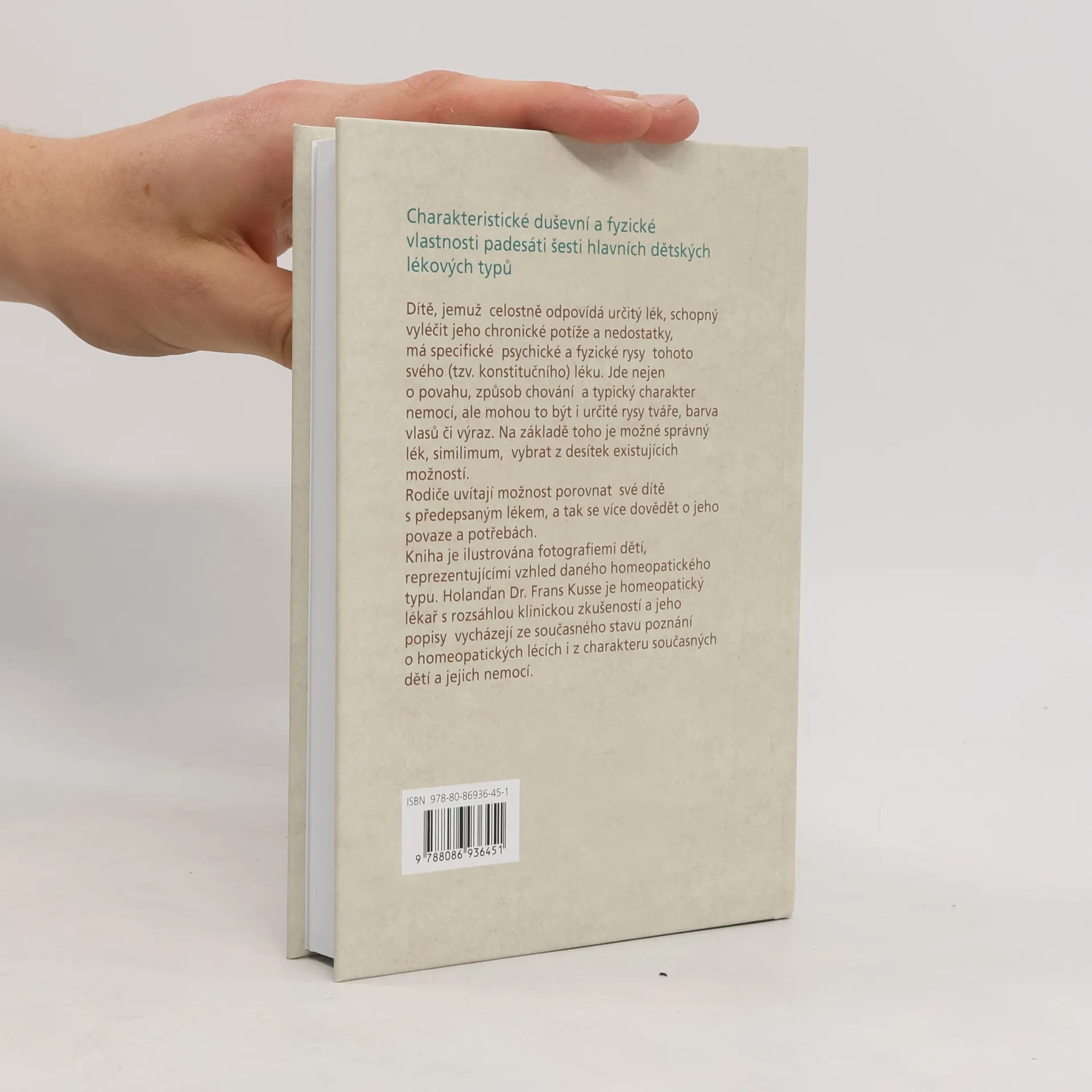 Charakteristické duševní a fyzické vlastnosti padesáti šesti hlavních dětských lékových typů. Dítě, jemuž celostně odpovídá určitý lék, schopný vyléčit jeho chronické potíže a nedostatky, má specifické psychické a fyzické rysy tohoto svého (tzv. konstitučního) léku. Jde nejen o povahu, způsob chování a typický charakter nemocí, ale mohou to být i určité rysy tváře, barva vlasů či výraz. Na základě toho je možné správný lék, similimum, vybrat z desítek existujících možností. Rodiče uvítají možnost porovnat své dítě s předepsaným lékem, a tak se více dovědět o jeho povaze a potřebách. Kniha je ilustrována fotografiemi dětí, reprezentujícími vzhled daného homeopatického typu. Holanďan Dr. Frans Kusse je homeopatický lékař s rozsáhlou klinickou zkušeností a jeho popisy vycházejí ze současného stavu poznání o homeopatických lécích i z charakteru současných dětí a jejich nemocí.