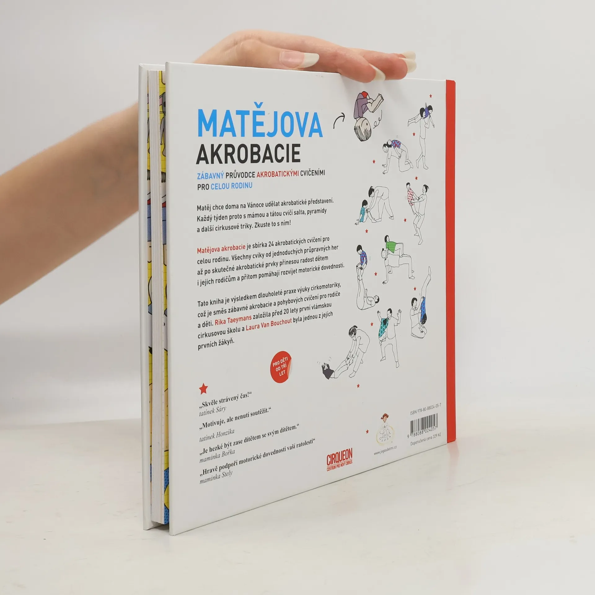 Matějova akrobacie je sbírka 24 akrobatických cvičení pro celou rodinu. Všechna cvičení od jednoduchých průpravných her až po skutečné akrobatické prvky přinášejí čistou radost dětem od 3 let i jejich rodičům a pomáhají přitom rozvíjet jejich motorické dovednosti. Matěj chce na Vánoce doma udělat akrobatické představení. Každý týden proto s mámou a tátou cvičí salta, pyramidy a další triky. Akrobacie popsaná v této publikace vychází z cirkusových technik a z procvičovacích her pohybově rozvojové metodiky Veronicy Sherborne. Rika Taeymans vyvinula tuto směs cirkusu a pohybové filozofie v 90. letech a pojmenovala ji „Cirkomotorika“. Dovednosti potřebné k tomu, aby bylo možné provádět akrobatické triky bezpečně a beze strachu, učí hravou formou pomocí procvičovacích her. Kromě zlepšení fyzických schopností a uvědomění si vlastního těla poskytují tato cvičení také emocionální podněty, a to díky vztahovým hrám.