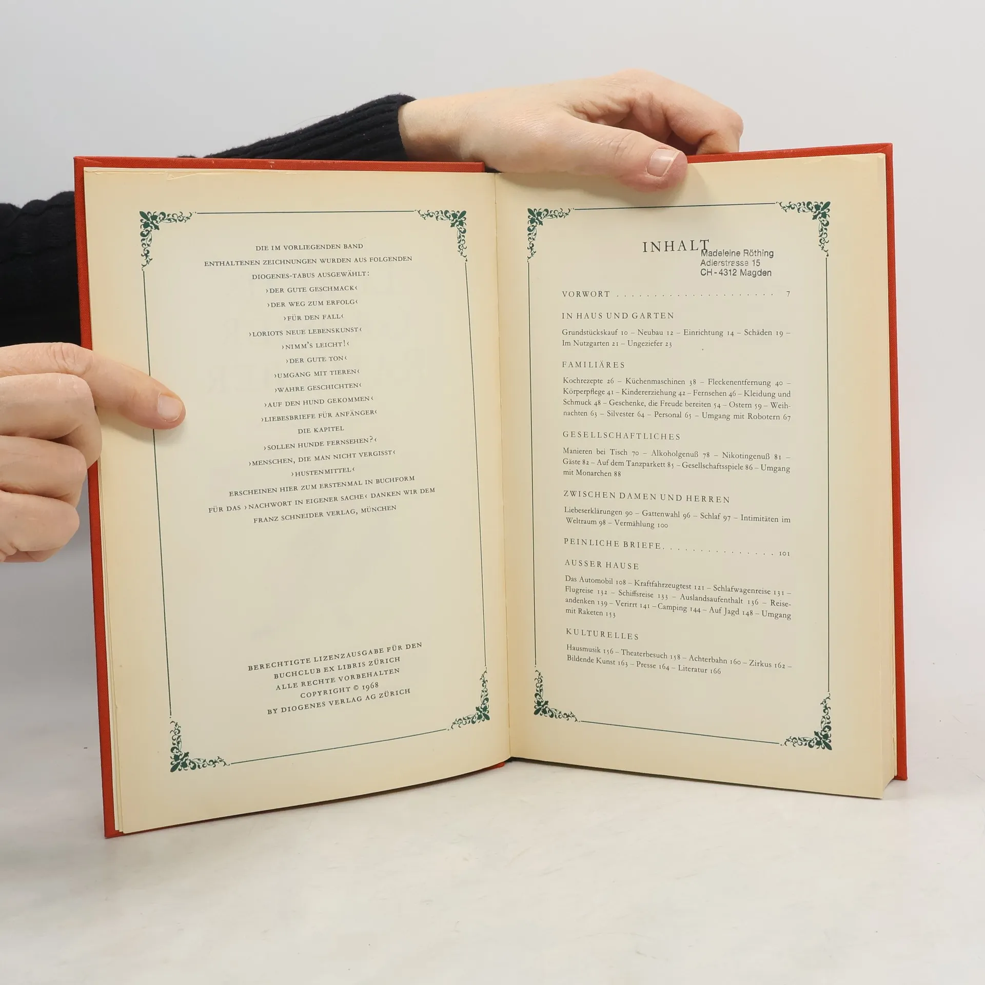 Ein Klassiker des modernen Lebens. Entstanden aus Loriots Gefühl der inneren Verpflichtung, »dem Menschen von heute ein Nachschlagewerk in die Hand zu geben, das ihm auch in kritischen Situationen korrektes Verhalten ermöglicht.« 500 Abbildungen und erläuternde Texte geben Auskunft über Tischmanieren, Gattenwahl, Einrichtung, Fleckenentfernung, Kleidung, Garten- und Körperpflege, Berufssorgen, Automobil-, Rasen- und Skisport, Alkohol- und Nikotingenuß, Husten, Theater, Film, Reisen, Jagd, Verirrungen, Nashörner, Maulwürfe, Hunde, Katzen, Mäuse und manch anderes mehr. Das unentbehrliche Kompendium für alle Haushaltungen.
