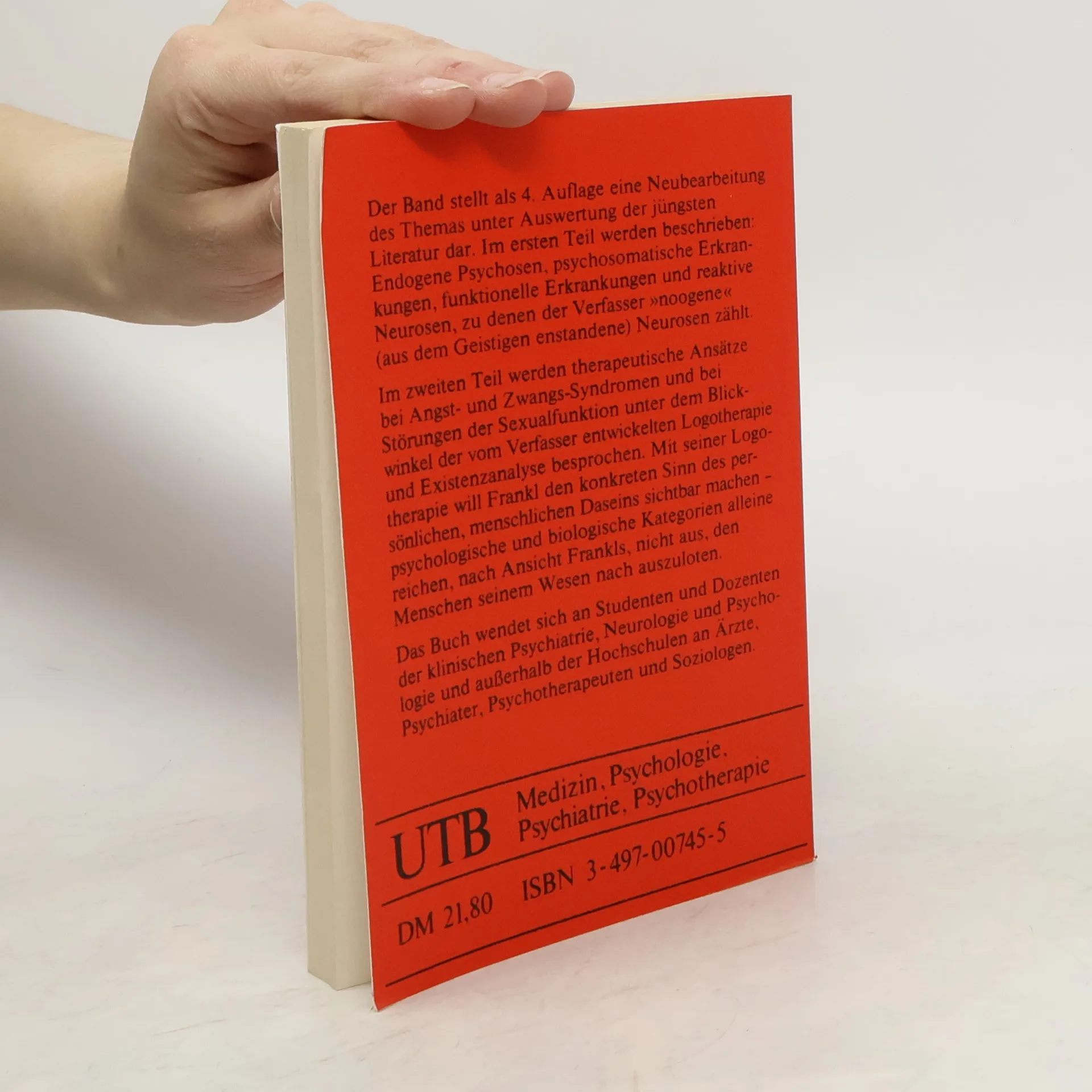 Viktor Frankl (1905–1997) entwickelt in diesem Buch eine systematisierte Neurosenlehre. Sie erstreckt sich von somatogenen, psychogenen und soziogenen bis hin zu noogenen Neurosen, die er nicht zuletzt auf einen Sinnverlust zurückführt. Eingehend beschreibt Frankl die von ihm begründete Existenzanalyse und Logotherapie als sinnzentrierte Psychotherapie, die helfen soll, Sinnmomente und persönliche Werte im Dasein aufzuspüren. Zentral sind dabei Techniken zur Selbstdistanzierung, wie die paradoxe Intention oder die Dereflexion. Empirische Forschungsergebnisse und ausführliche Fallbeispiele stützen und erläutern sowohl Theorie als auch Praxis. Das Buch wendet sich an Studenten und Dozenten der klinischen Psychiatrie, Neurologie und Soziologie sowie an in der Praxis stehende Ärzte, Fachärzte und Psychotherapeuten.