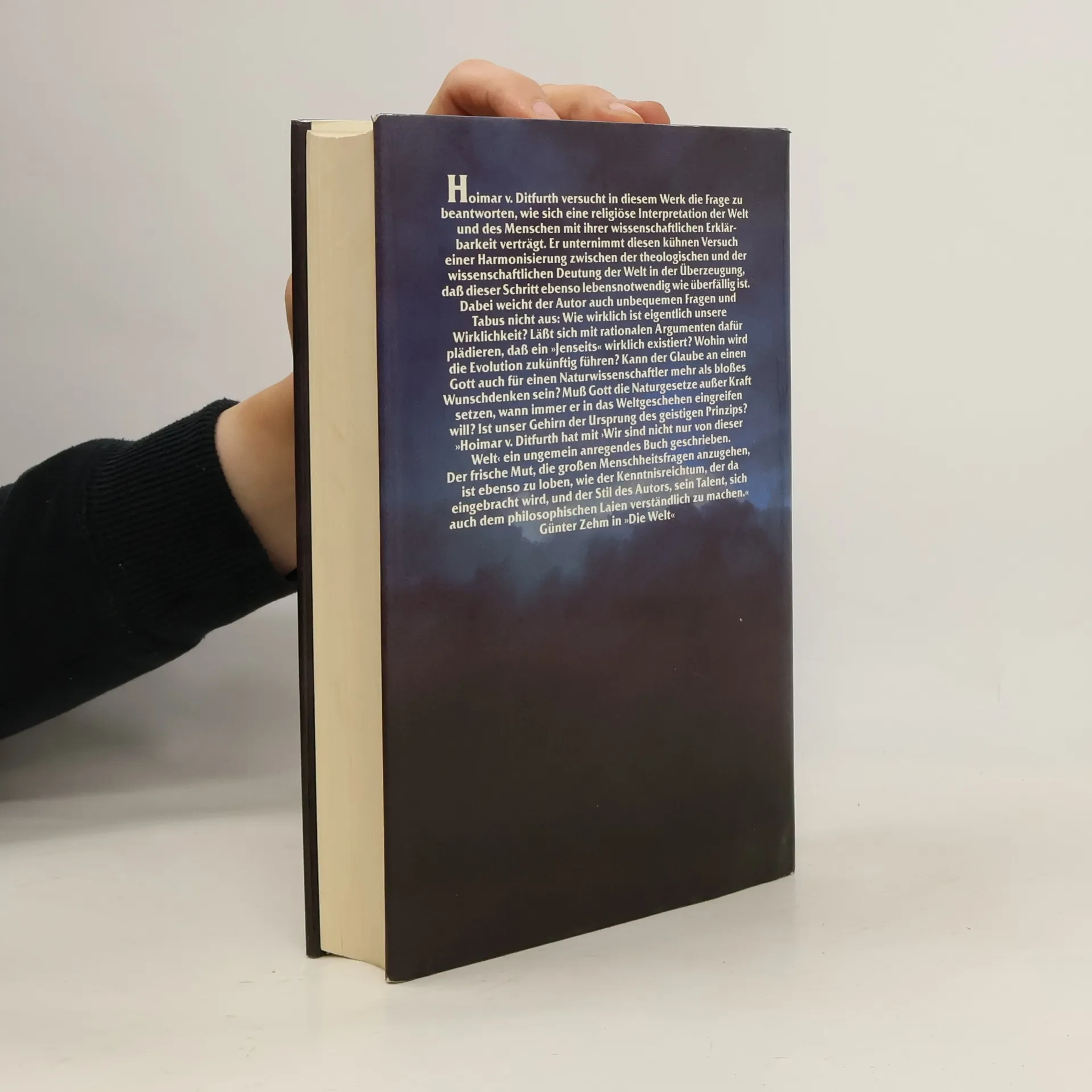 "Kann man an die Existenz oder gar an die tätige Anwesenheit eines Gottes in einem Universum glauben, das sich nach einigen Jahrhunderten naturwissenschaftlicher Forschung unserem Verstand als erklärbar zu präsentieren begonnen hat?" Mit dieser einfachen, aber für uns Menschen heute lebensnotwendigen Frage beschäftigt sich dieses Buch von Hoimar v. Ditfurth. Er versucht dabei nichts Geringeres, als die naturwissenschaftliche Deutung der Welt mit ihrer religiösen Interpretation zu verbinden. Ditfurth unternimmt diesen Versuch in der Überzeugung, daß der Brückenschlag zwischen theologischem und naturwissenschaftlichem Weltbild überfällig geworden und ohne fundamentale Widersprüche möglich ist. Im Zentrum seiner Darstellung steht dabei der für die moderne Naturwissenschaft grundlegende Gedanke der Evolution: "Bemerkenswerterweise liefert gerade dieses geistige Konzept einen entscheidenden Schlüssel zu einem besseren, in mancher Hinsicht ganz neuen Verständnis uralter theologischer Aussagen, bis hin zu der Behauptung von der Realität einer jenseitigen Wirklichkeit."