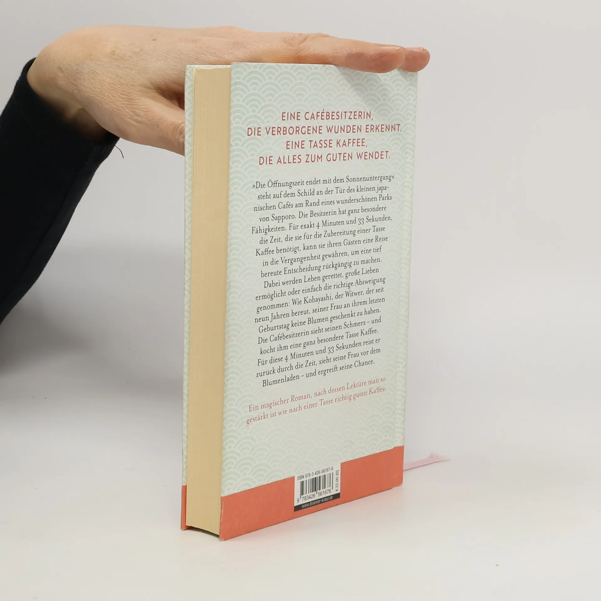 Eine Cafébesitzerin, die verborgene Wunden erkennt. Eine Tasse Kaffee, die Leben verändert. Eine Lektüre, die inspiriert. "Die Öffnungszeit endet mit dem Sonnenuntergang" steht auf dem Schild an der Tür des kleinen japanischen Cafés am Rand eines wunderschönen Parks von Sapporo. Die Besitzerin Frau Hayari ist eine Barista mit ganz besonderen Fähigkeiten. Exakt 4 Minuten und 33 Sekunden, die Zeit, sie für die Zubereitung einer Tasse Kaffee benötigt, kann sie ihren Gästen eine Reise in die Vergangenheit gewähren, um eine tief bereute Entscheidung rückgängig zu machen. Dabei werden Leben gerettet, große Lieben ermöglicht oder einfach die richtige Abzweigung genommen: Die Studentin Himari wünscht nichts sehnlicher, als ihre Karriere als Pianistin fortführen zu können und den Unfall, der ihre Hand so sehr verletzte, ungeschehen zu machen. Oder Kobayashi, der Witwer, der seit neun Jahren bereut, seiner Frau an ihrem letzten Geburtstag keine Blumen geschenkt zu haben: Die fallenden Wassertropfen des Kaffeefilters hallen immer tiefer und langsamer wider. Kobayashis Bewusstsein verschwindet wie der Wirbel einer unergründlichen Quelle. Für diese vier Minuten und dreiunddreißig Sekunden reist er durch die Zeit, sieht seine Frau vor dem Blumenladen - und ergreift seine Chance. Ein magischer Roman, nach dessen Lektüre man so gestärkt ist wie nach einer Tasse richtig guten Kaffee.