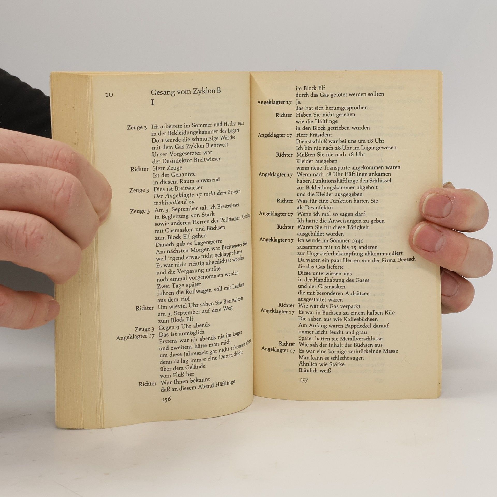 Zwischen Dezember 1963 und August 1965 fand in Frankfurt am Main der Auschwitz-Prozeß statt, in dem die für das Funktionieren der Vernichtungsmaschinerie Verantwortlichen vor Gericht standen. Peter Weiss hat in seinem 1965 gleichzeitig an 15 Orten uraufgeführten dokumentarischen Theaterstück die Fakten über diese Hölle auf Erden, die im Prozeß zur Sprache kamen, in Gesängen gestaltet: Gesang von der Rampe, Gesang vom Lager, Gesang vom Bunkerblock. In ihnen wurden Täter und Opfer miteinander konfrontiert, und auf diese Weise wird, gerade durch den Verzicht der Rekonstruktion individueller Erlebnisse und die Betonung der funktionalen Aspekte, das Grauen dieser Tötungsfabrik deutlich. Zugleich wird die Möglichkeit gezeigt, daß sich ähnliches wiederholen könnte, und die Notwendigkeit, dies zu verhindern.