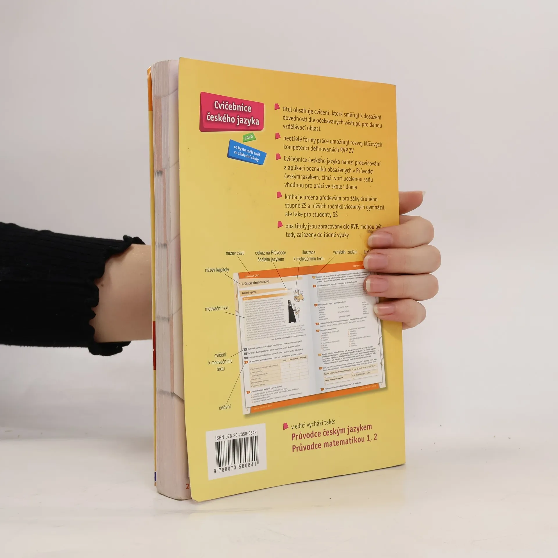 Titul obsahuje cvičení, která směřují k dosažení dovedností dle očekávaných výstupů pro vzdělávací oblast "Jazyk a jazyková komunikace". Neotřelé formy práce umožňují rozvoj klíčových kompetencí definovaných RVP ZV. Cvičebnice českého jazyka přináší úkoly k procvičování a aplikaci poznatků obsažených v Průvodci českým jazykem, čímž tvoří ucelenou sadu učebních materiálů vhodnou pro práci ve škole i doma.Publikace je zpracovaná podle RVP ZV, důraz klade zejména na získání praktických dovedností, dosažení očekávaných výstupů a rozvoj klíčových kompetencí. Kniha je rozdělena na tři hlavní části: jazykovou část, komunikační – slohovou část a pravopisnou část. Publikace je určená všem žákům druhého stupně základních škol a nižších tříd víceletých gymnázií. Taktéž je určena učitelům českého jazyka, kteří zde najdou bohatou zásobu cvičení, úloh a úkolů, které využijí ve svých hodinách (jediný titul tohoto charakteru na trhu, který se zaměřuje na rozvoj klíčových kompetencí a sleduje očekávané výstupy – plně v souladu s RVP ZV). Žáci i učitelé ocení cvičebnici nejen v hodinách českého jazyka, ale i při domácí přípravě na vyučování a také při přípravě na přijímací zkoušky na střední školy. Publikaci využijí i studenti a učitelé středních škol (zejména v nižších ročnících za účelem opakování látky, kterou by měli studenti znát ze základní školy).