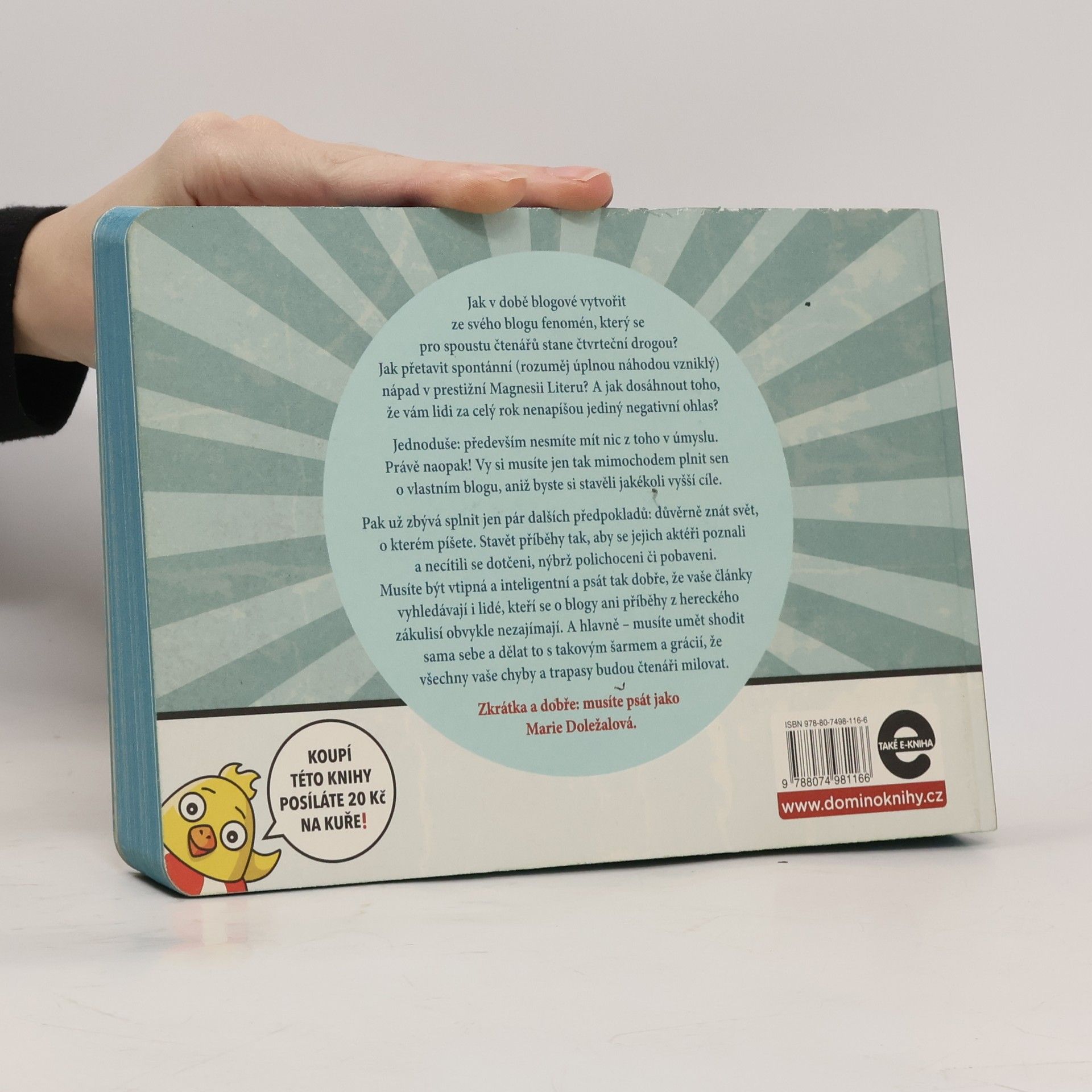 Jak v době blogové vytvořit ze svého blogu fenomén, který se pro zástupy čtenářů stane čtvrteční drogou? Jak přetavit spontánní (rozuměj úplnou náhodou vzniklý) nápad v prestižní Magnesii Literu? A jak dosáhnout toho, že vám lidi za celý rok nenapíšou jediný negativní ohlas? Jednoduše: především nesmíte mít nic z toho v úmyslu. Právě naopak! Vy musíte jen tak mimochodem uskutečňovat sen o vlastním blogu, aniž byste si stavěli jakékoli vyšší cíle. Pak už zbývá jen pár dalších předpokladů: důvěrně znát svět, o kterém píšete. Psát tak, aby se všichni aktéři popisovaných příhod poznali, a cítili se polichoceni či pobaveni, nikoli dotčeni. Musíte být vtipná a inteligentní a psát tak dobře, že vaše články vyhledávají i lidé, kteří by za jiných okolností žádný blog ani historky z hereckého zákulisí nikdy nečetli (ze zásady). A hlavně – musíte umět shodit sama sebe a dělat to s takovým šarmem a grácií, že všechny vaše chyby a trapasy budou čtenáři milovat. Zkrátka a dobře: musíte psát jako Marie Doležalová. A když se k tomu přidají geniální ilustrace Jana Hofmana, vznikne kniha, kterou prostě chcete mít. Kterou chcete dát jako dárek. Protože tahle kniha vám zvedne náladu tak jako žádná jiná!