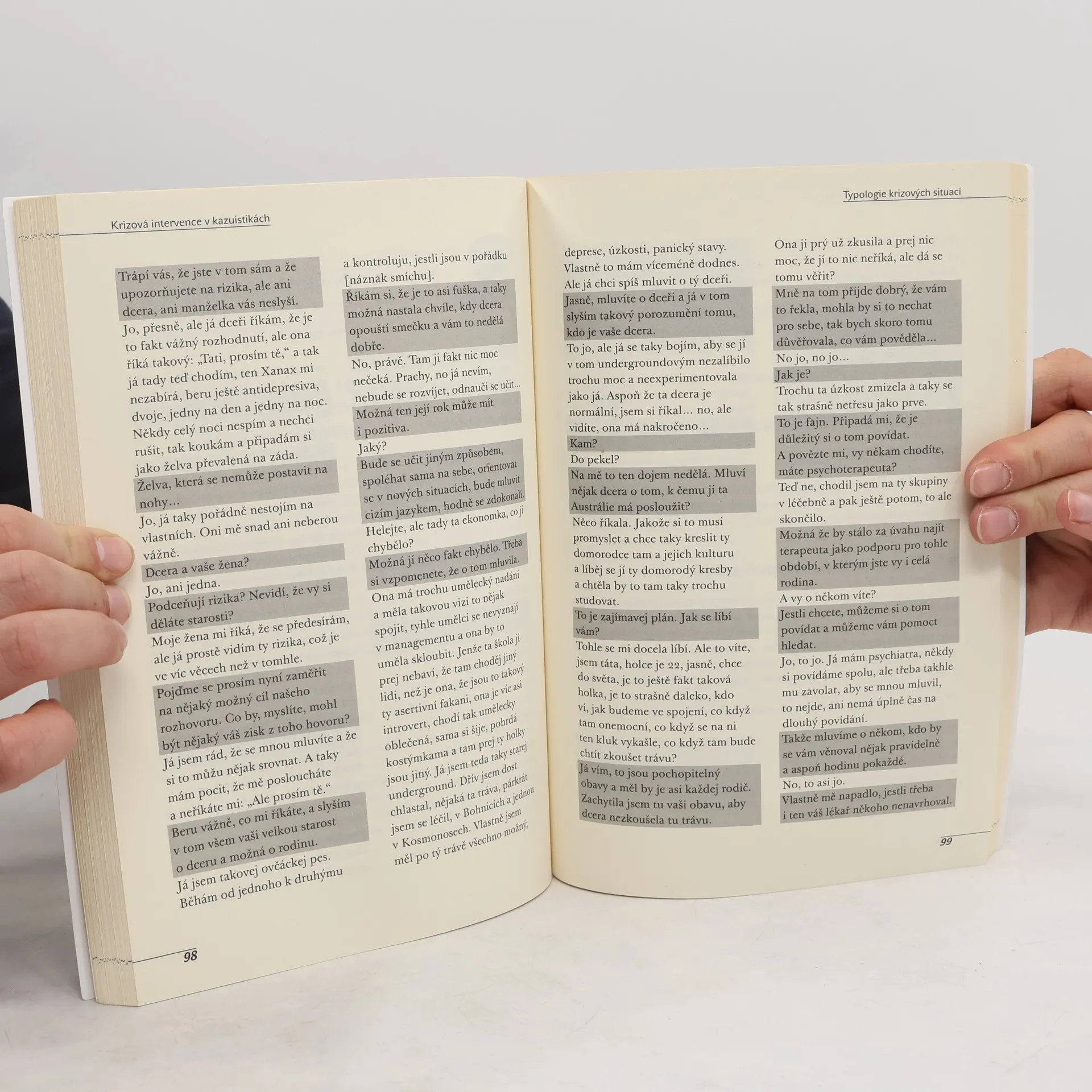První část knihy pomocí příběhů podává základní údaje o krizi a krizové intervenci a na kazuistikách ilustruje základní postupy řešení krizových situací. Druhá část pojednává o jednotlivých typech těchto situací a ukazuje hlavní vodítka pro řešení (na co nezapomenout, s čím a jak pracovat) i řadu kazuistik, které probíraná témata propojují. Kazuistiky pocházejí z oblasti telefonické intervence i z rozhovorů tváří v tvář. Záměrem knihy není podat vyčerpávající informace o krizové intervenci, ale ukázat praktické příběhy krize, které mohou potkat každého z nás. Každý příběh je originální a neexistuje pro něj jediné řešení. Každý pracovník pracuje jiným způsobem a používá různé metody v různém kontextu. Proto má předkládaný text čtenáře podporovat v hledání dalších cest a vlastních způsobů při krizové práci. Publikace tak zahrnuje i pasáže, které se čtenářem interagují pomocí otázek, úkolů či nedokončených částí.
