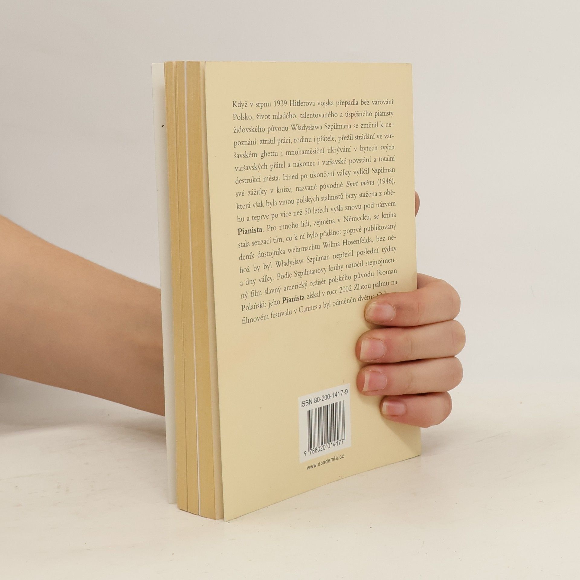 ISBN 978-80-200-1417-7 (dotisk 2007 ; brož.) Když v srpnu 1939 Hitlerova vojska přepadla bez varování Polsko, život mladého, talentovaného a úspěšného pianisty židovského původu Władysława Szpilmana se změnil k nepoznání: ztratil práci, rodinu i přátele, přežil strádání ve varšavském ghettu i mnohaměsíční ukrývání v bytech svých varšavských přátel a nakonec i varšavské povstání a totální destrukci města. Hned po ukončení války vylíčil Szpilman své zážitky v knize, nazvané původně Smrt města (1946), která však byla vinou polských stalinistů brzy stažena z oběhu a teprve po více než 50 letech vyšla znovu pod názvem Pianista. Pro mnoho lidí, zejména v Německu, se kniha stala senzací tím, co k ní bylo přidáno: poprvé publikovaný deník důstojníka wehrmachtu Wilma Hosenfelda, bez něhož by byl Władysław Szpilman nepřežil poslední týdny a dny války. Podle Szpilmanovy knihy natočil stejnojmenný film slavný americký režisér polského původu Roman Polański: jeho Pianista získal v roce 2002 Zlatou palmu na filmovém festivalu v Cannes a byl odměněn dvěma Oskary.