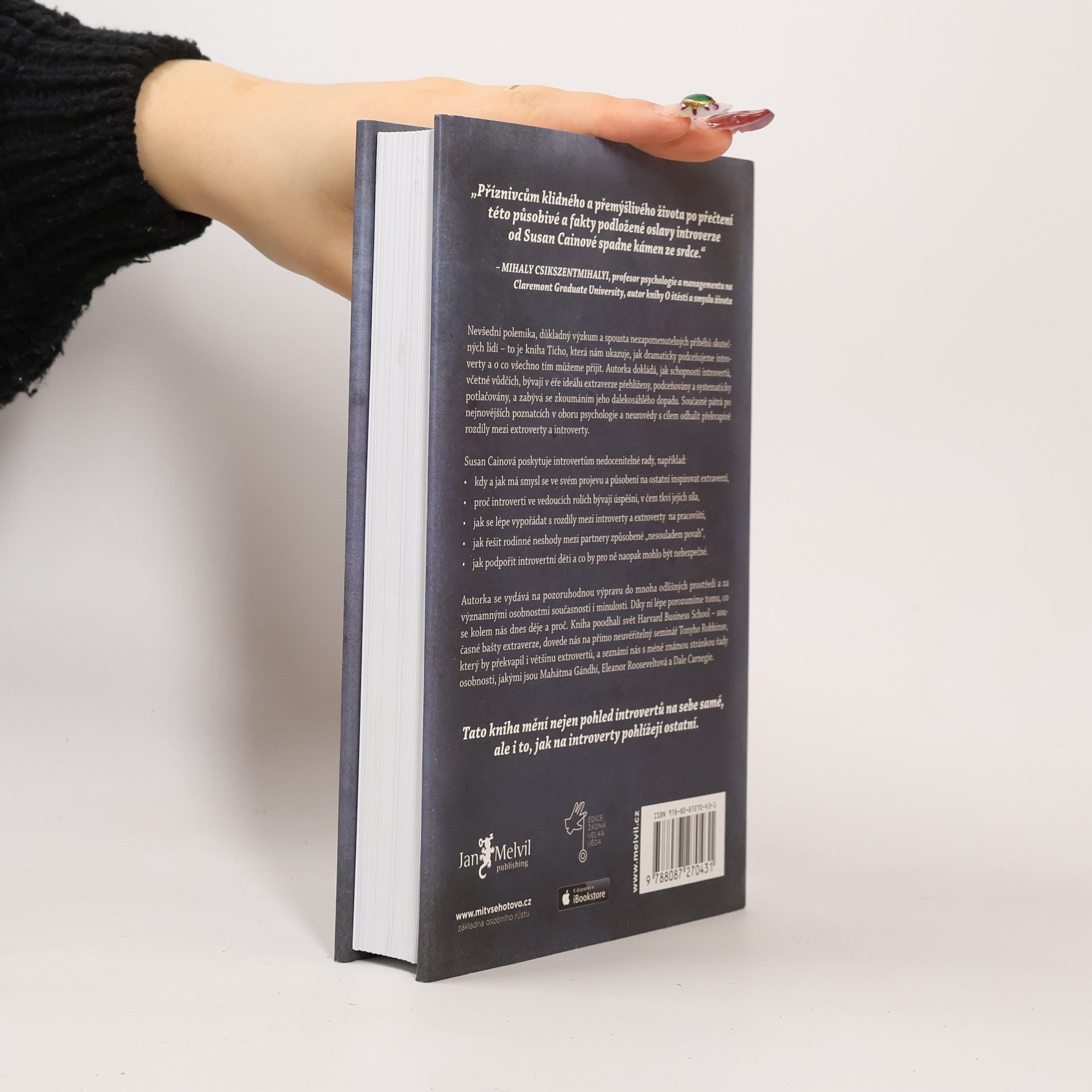 Kolik skutečných introvertů znáte? Odpověď vás možná překvapí. V kultuře, která nás od základní školy až po byznys vychovává k týmové práci, je vše nastavené pro úspěch extrovertů. Až díky této knize získali ti tiší svou mluvčí: Susan Cainovou. Její čtivý, důkladný a překvapivý text o tiché síle introvertů se stal velice rychle bestsellerem a autorka celebritou. Je to paradox, když sama o sobě prohlašuje, že je introvertem?