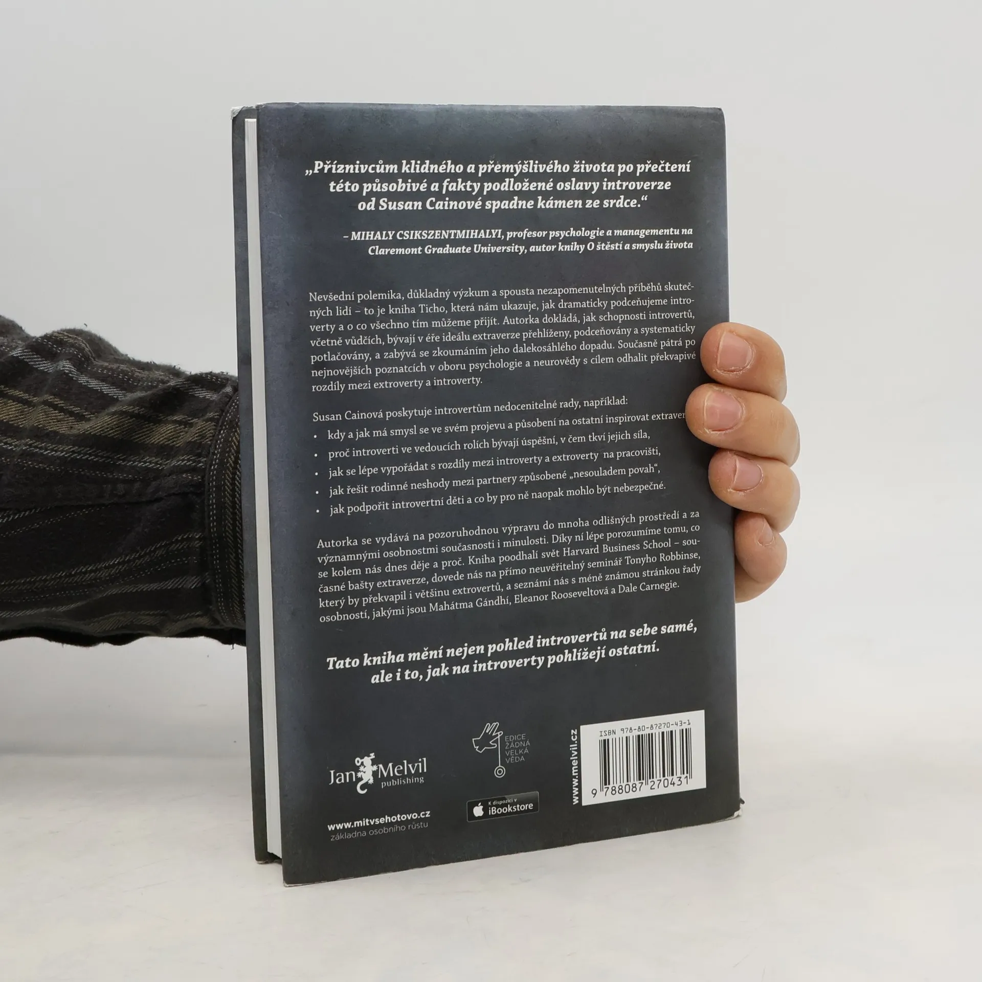 Kolik skutečných introvertů znáte? Odpověď vás možná překvapí. V kultuře, která nás od základní školy až po byznys vychovává k týmové práci, je vše nastavené pro úspěch extrovertů. Až díky této knize získali ti tiší svou mluvčí: Susan Cainovou. Její čtivý, důkladný a překvapivý text o tiché síle introvertů se stal velice rychle bestsellerem a autorka celebritou. Je to paradox, když sama o sobě prohlašuje, že je introvertem?