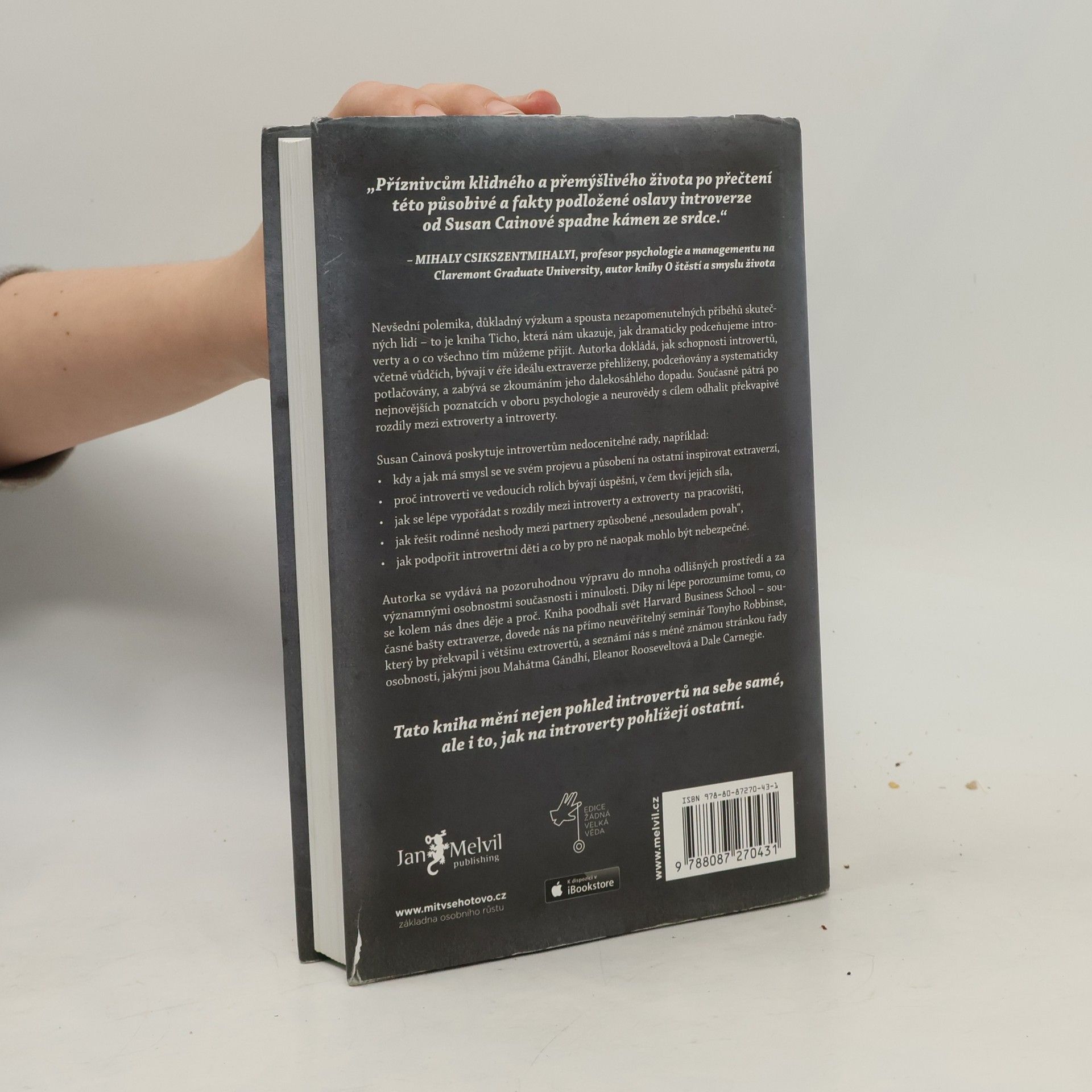 Kolik skutečných introvertů znáte? Odpověď vás možná překvapí. V kultuře, která nás od základní školy až po byznys vychovává k týmové práci, je vše nastavené pro úspěch extrovertů. Až díky této knize získali ti tiší svou mluvčí: Susan Cainovou. Její čtivý, důkladný a překvapivý text o tiché síle introvertů se stal velice rychle bestsellerem a autorka celebritou. Je to paradox, když sama o sobě prohlašuje, že je introvertem?