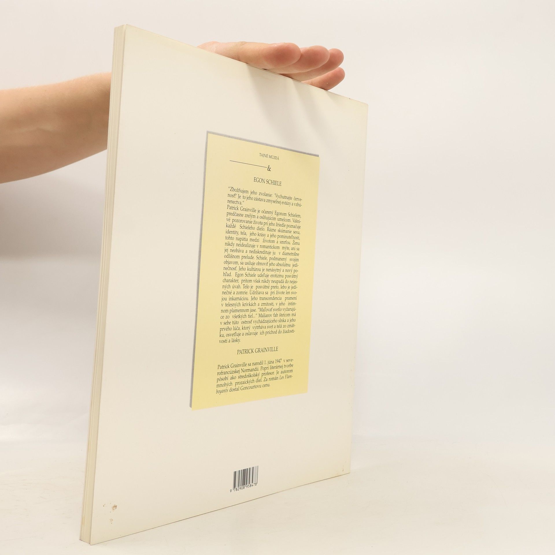 „Zbožňujem jeho zvolanie: „Vychutnajte červenosť“ Je to jeho zástava zmyselnej extázy a vzbúrenectva.“ Patrick Grainville je očarený Egonom Schielem, predčasne zrelým a oslňujúcim umelcom. Vášnivé pozorovanie života pri jeho žriedle poznačuje každé Schieleho dielo. Rázne skúmanie sexu, identity, tela, jeho krásy a jeho pominuteľnosti, tohto napätia medzi životom a smrťou. Ženu nikdy neidealizuje v romantickom mýte, ani sa jej neobáva a nediskredituje ju v diametrálne odlišnom prelude. Schiele, podmanený svojím objavom, sa usiluje obnoviť jeho absolútnu jedinečnosť. Jeho kultúrou je nenásytný a nový pohľad. Egon Schiele udeľuje erotizmu posvätný charakter, pritom však nikdy neupadá do nejasných úvah. Telo je posvätné preto, lebo je jedinečné a zomrie. Udržiava sa pri živote len svojou inkarnáciou. Jeho transcendencia pramení v telesných krivkách a zrnitosti, v jeho intímnom plamennom jase. „Maľovať svetlo vyžarujúce zo všetkých tiel...“ Maliarov ťah štetcom má v sebe túto ostrosť vychádzajúceho slnka a jeho prvého lúča, ktorý vytrháva svet a telá zo zmätku, osvetľuje a oslavuje ich príchod do žiadostivosti a lásky.
