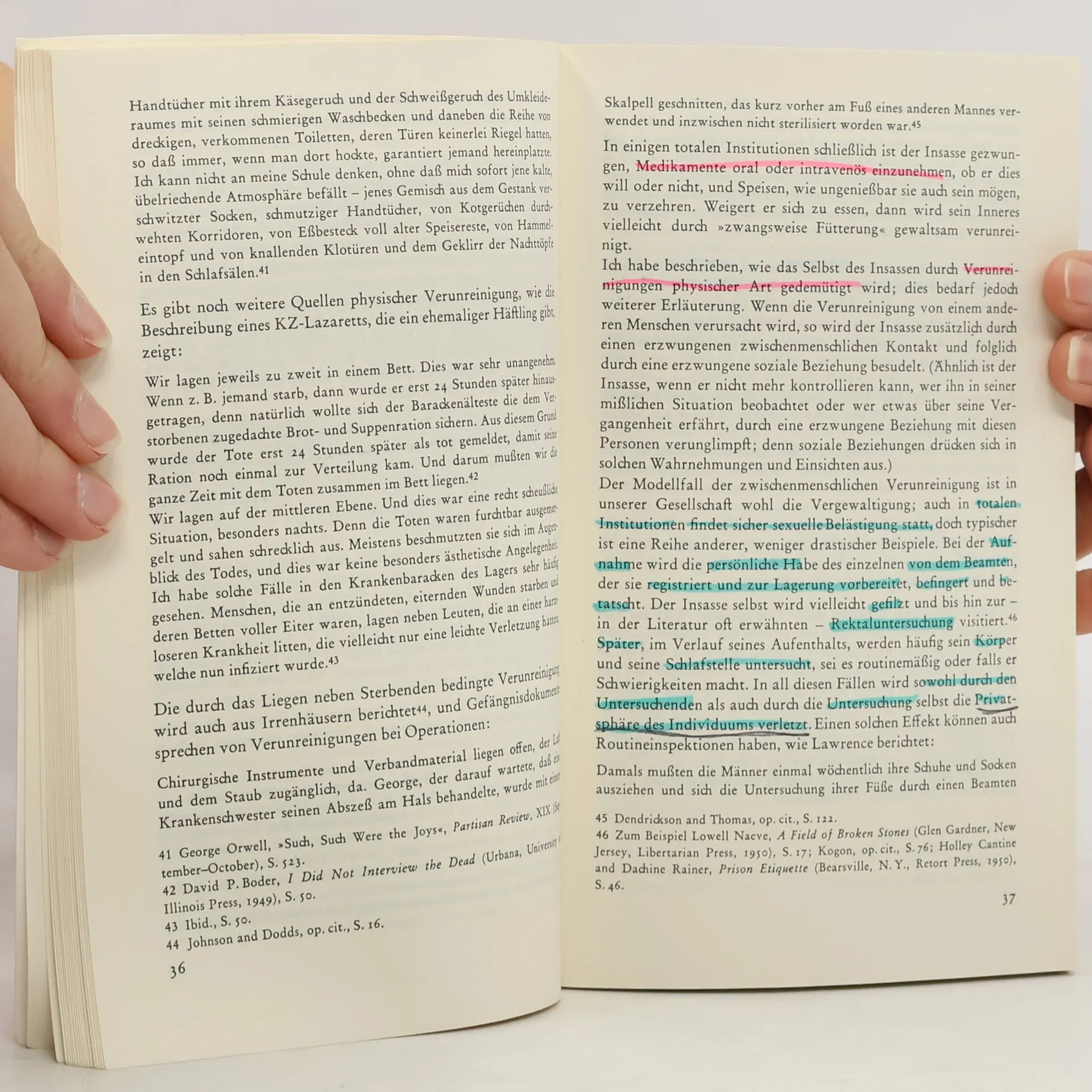 "Was in der Irrenanstalt von Görz oder in den Patientenkollektiven versucht wird, ist die Umkehrung jener »moralischen Karriere« des Patienten, die er beschrieben hat. Totale Institutionen sind geschlossene Welten wie Gefängnisse, Kasernen, Internate, Klöster, Altenheime Irrenhäuser. Goffman untersucht das Leben in diesen Institutionen, besonders in den Irrenhäusern und Sanatorien; er zeigt auf, was sie aus den Insassen machen und was diese daraus machen können. Die zentrale These ist, daß der wichtigste Faktor, der einen Patienten prägt, nicht seine Krankheit ist, sondern die Institution, der er ausgeliefert ist; seine Reaktionen und Anpassungsleistungen gleichen denen der Insassen anderer totaler Institutionen, mit deren Hilfe die Gesellschaft sich funktionsfähig erhält."
