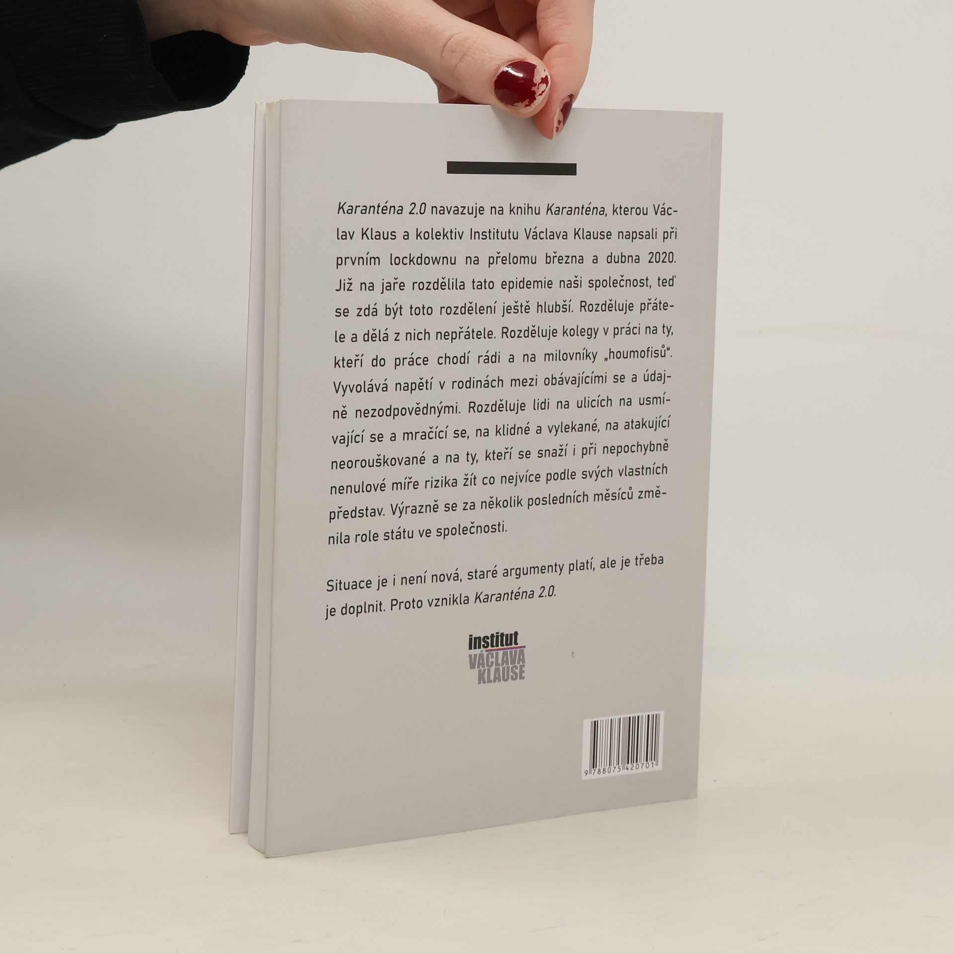 Karanténa 2.0 navazuje na předchozí dílo, které Václav Klaus a kolektiv Institutu Václava Klause napsali během prvního lockdownu na jaře 2020. V úvodu Klaus vyjadřuje touhu poskytnout uklidňující slova a přispět k racionální vládní politice. Epidemie rozděluje společnost, což se na podzim prohlubuje. Přátelé se stávají nepřáteli, kolegové se dělí na ty, kteří preferují práci v kanceláři, a na milovníky práce z domova. Napětí narůstá i v rodinách mezi těmi, kdo se obávají, a těmi, kdo jsou považováni za nezodpovědné. Na ulicích se lidé dělí na usmívající se a mračící se, na klidné a vylekané, a na ty, kteří se snaží žít podle svých představ navzdory riziku. Role státu se dramaticky změnila; z okrajové instituce se stal všudypřítomný demiurg ovlivňující každou minutu našich životů. Ačkoliv staré argumenty zůstávají platné, je nutné je doplnit. Autoři již dříve vyjádřili obavy z lidí více než z virů, a nyní je jasné, že strach se více soustředí na dění v lidské společnosti mimo medicínskou sféru. Karanténa 2.0, vzniklá na základě diskusí uvnitř Institutu, je autorským textem, který reflektuje tyto změny.