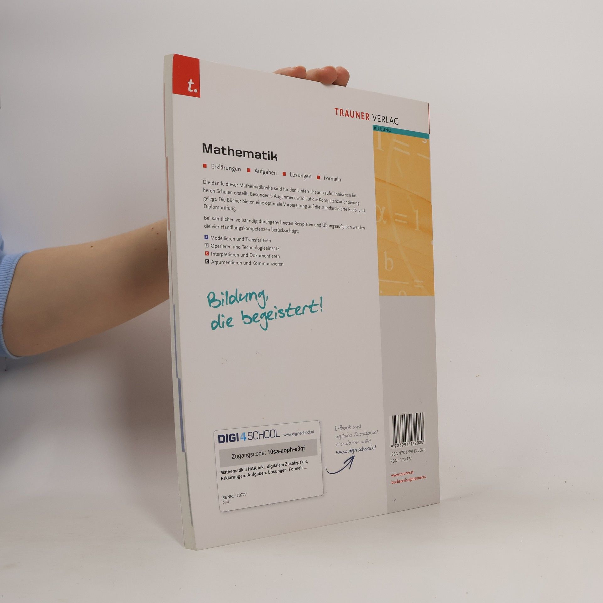 Die Bände dieser Mathematikreihe sind für den Unterricht an kaufmännischen höherenSchulen erstellt. Besonderes Augenmerk wird auf die Kompetenzorientierunggelegt. Die Bücher bieten eine optimale Vorbereitung auf die standardisierte Reife- undDiplomprüfung.Bei sämtlichen vollständig durchgerechneten Beispielen und Übungsaufgaben werdendie vier Handlungskompetenzen berücksichtigt:A Modellieren und TransferierenB Operieren und TechnologieeinsatzC Interpretieren und DokumentierenD Argumentieren und Kommunizieren