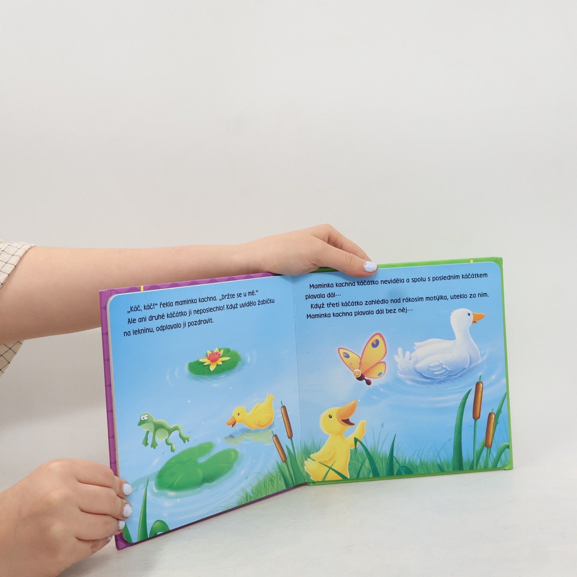 Káč! Káč! Kdo našel káčátka, která se ztratila mamince kachně? Když budeš chtít, můžeš si káčátko pohladit po heboučké plyšové hlavičce.