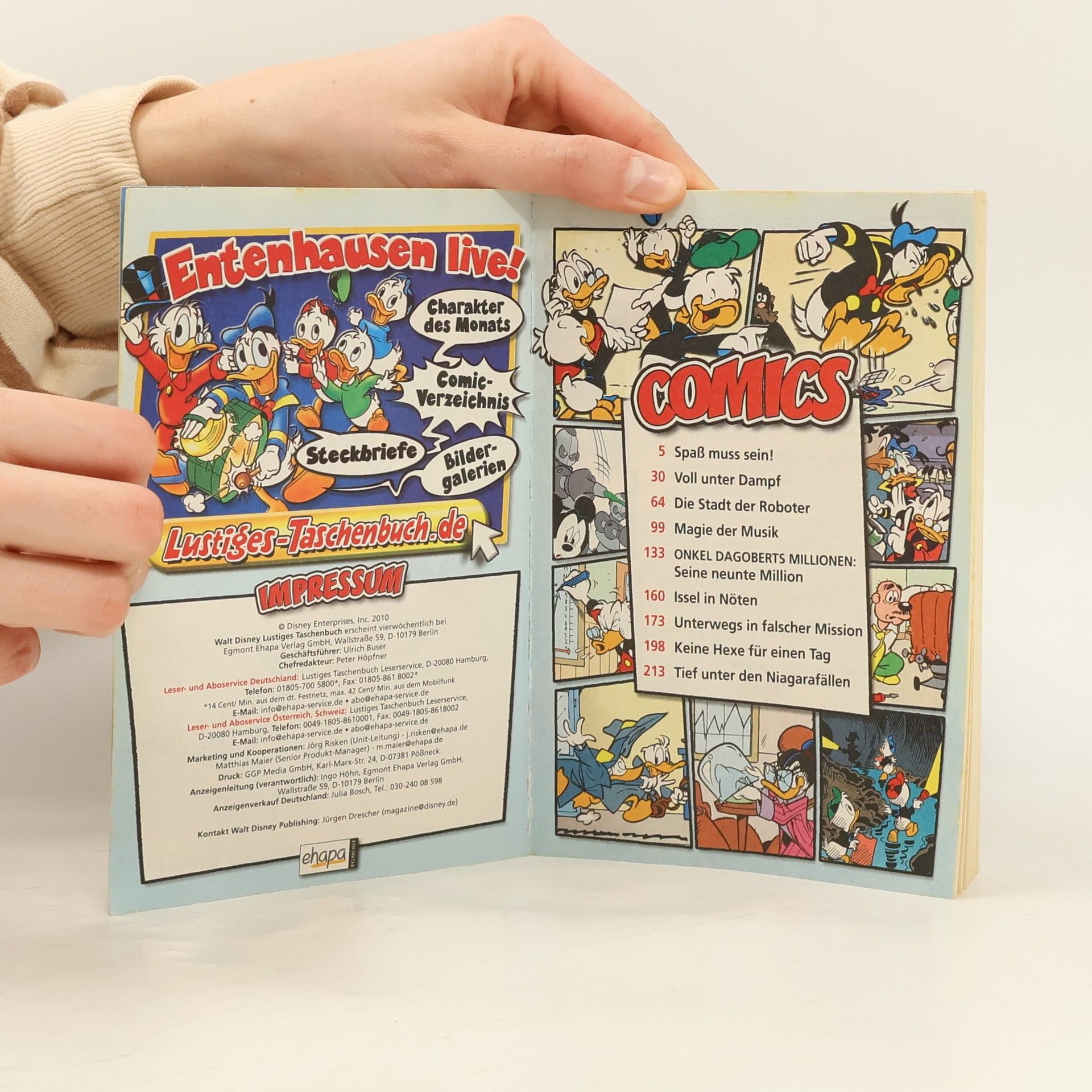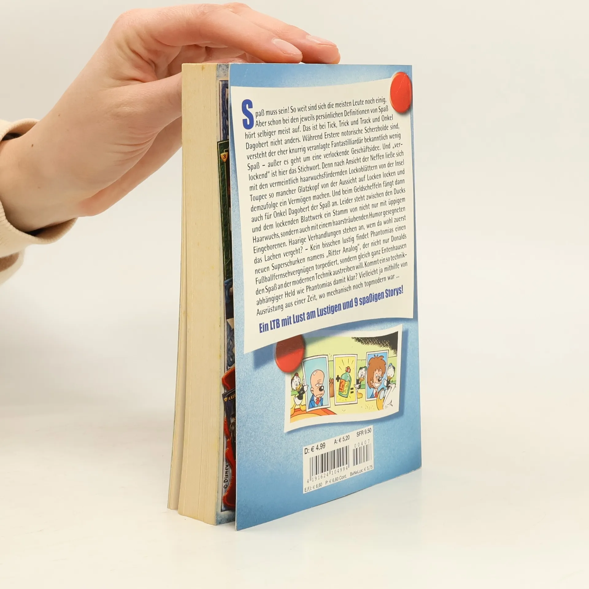 Spaß muss sein! So weit sind sich die meisten Leute noch einig. Aber schon bei den jeweils persönlichen Definitionen von Spaß hört selbiger meist auf. Das ist bei Tick, Trick und Track und Onkel Dagobert nicht anders. Während Erstere notorische Scherzbolde sind, versteht der eher knurrig veranlagte Fantastilliardär bekanntlich wenig Spaß – außer es geht um eine verlockende Geschäftsidee. Und „verlockend“ ist hier das Stichwort. Denn nach Ansicht der Neffen ließe sich mit den vermeintlich haarwuchsfördernden Lockoblättern von der Insel Toupee so mancher Glatzkopf von der Aussicht auf Locken locken und demzufolge ein Vermögen machen. Und beim Geldscheffeln fängt dann auch für Onkel Dagobert der Spaß an. Leider steht zwischen den Ducks und dem lockenden Blattwerk ein Stamm von nicht nur mit üppigem Haarwuchs, sondern auch mit einem haarsträubenden Humor gesegneten Eingeborenen. Haarige Verhandlungen stehen an, wem da wohl zuerst das Lachen vergeht? – Kein bisschen lustig findet Phantomias einen neuen Superschurken namens „Ritter Analog“, der nicht nur Donalds Fußballfernsehvergnügen torpediert, sondern gleich ganz Entenhausen den Spaß an der modernen Technik austreiben will. Kommt ein so technikabhängiger Held wie Phantomias damit klar? Vielleicht ja mithilfe von Ausrüstung aus einer Zeit, wo mechanisch noch topmodern war ...Ein LTB mit Lust am Lustigen und 9 spaßigen Storys!