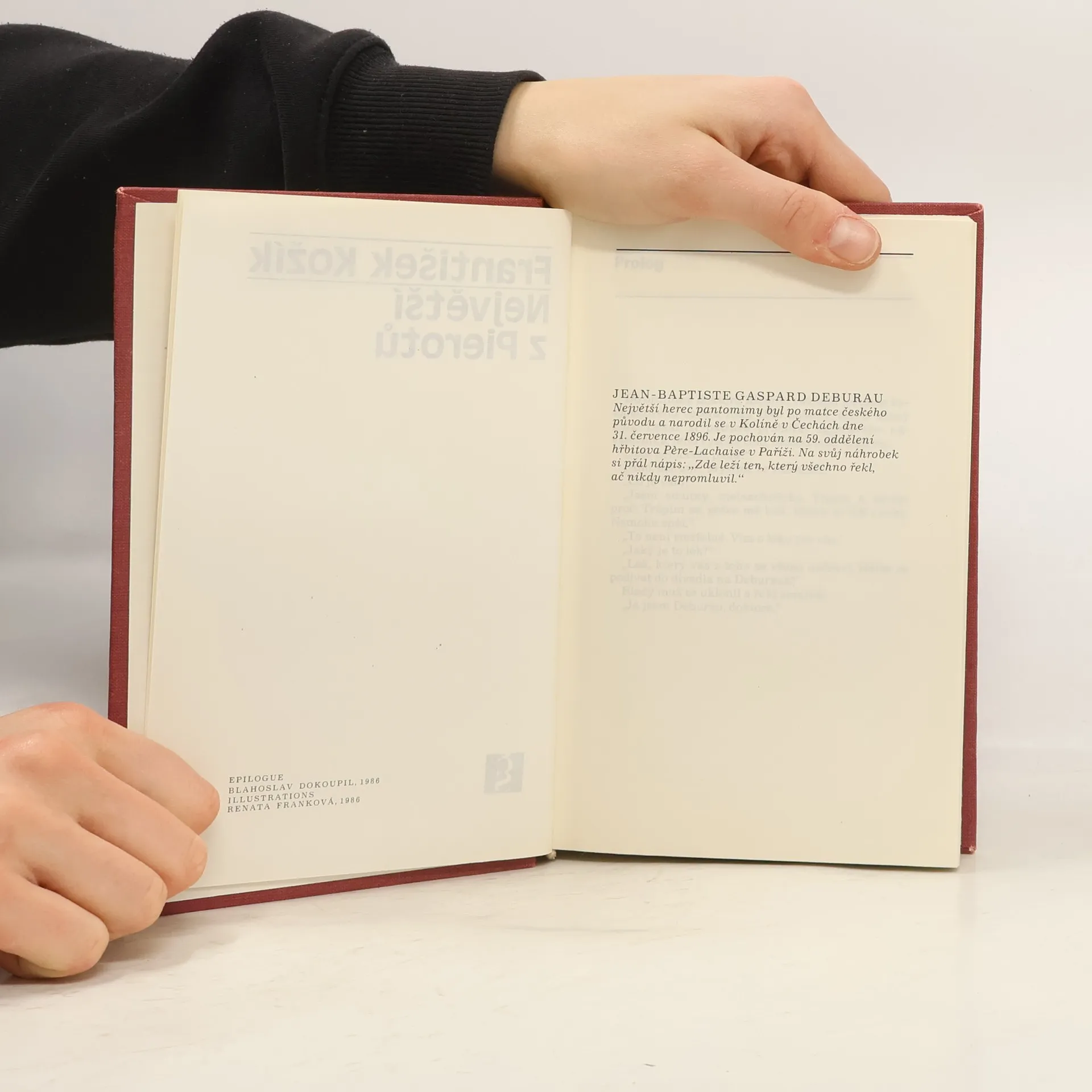 Franková Renata ilustrace černobílé celostránkové. Rozsáhlý román inspirovaný životní a uměleckou dráhou mistra pantomimy Jeana Gaspara Deburaua (1796-1846), který byl po své matce českého původu. Autor líčí jeho dětství a mládí strávené uprostřed kočovné artistické společnosti,léta čekání na výraznější umělecký úspěch a konečně i léta triumfu a uznání. V Paříži dosáhl po mnoha letech nesmírné popularity a byl milován a obdivován všemi - od prostého publika až po přestavitele kulturní elity tehdejší Francie. Román není životopisem v pravém slova smyslu, ale především psychologickou studií o cestě umělce za vyjádřením svých představ a poetickou básní o divadle a lidském životě.