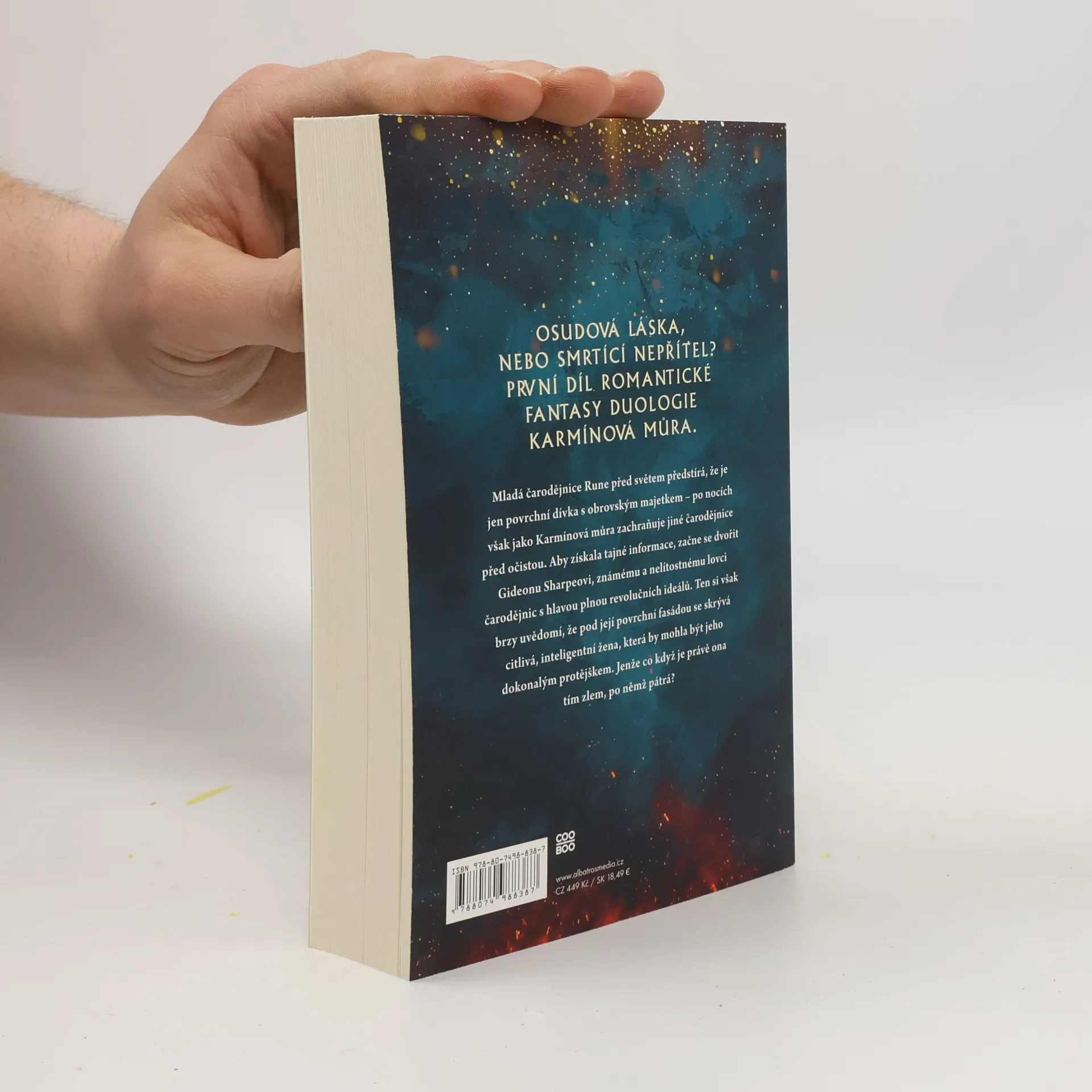 Osudová láska, nebo smrtící nepřítel? První díl romantické fantasy duologie. Mladá čarodějnice Rune před světem předstírá, že je jen povrchní dívka s obrovským majetkem – po nocích však jako Karmínová můra zachraňuje jiné čarodějnice před očistou. Aby získala tajné informace, začne se dvořit Gideonu Sharpeovi, známému a nelítostnému lovci čarodějnic s hlavou plnou revolučních ideálů. Ten si však brzy uvědomí, že pod její povrchní fasádou se skrývá citlivá, inteligentní žena, která by mohla být jeho dokonalým protějškem. Jenže co když je právě ona tím zlem, po němž pátrá?
