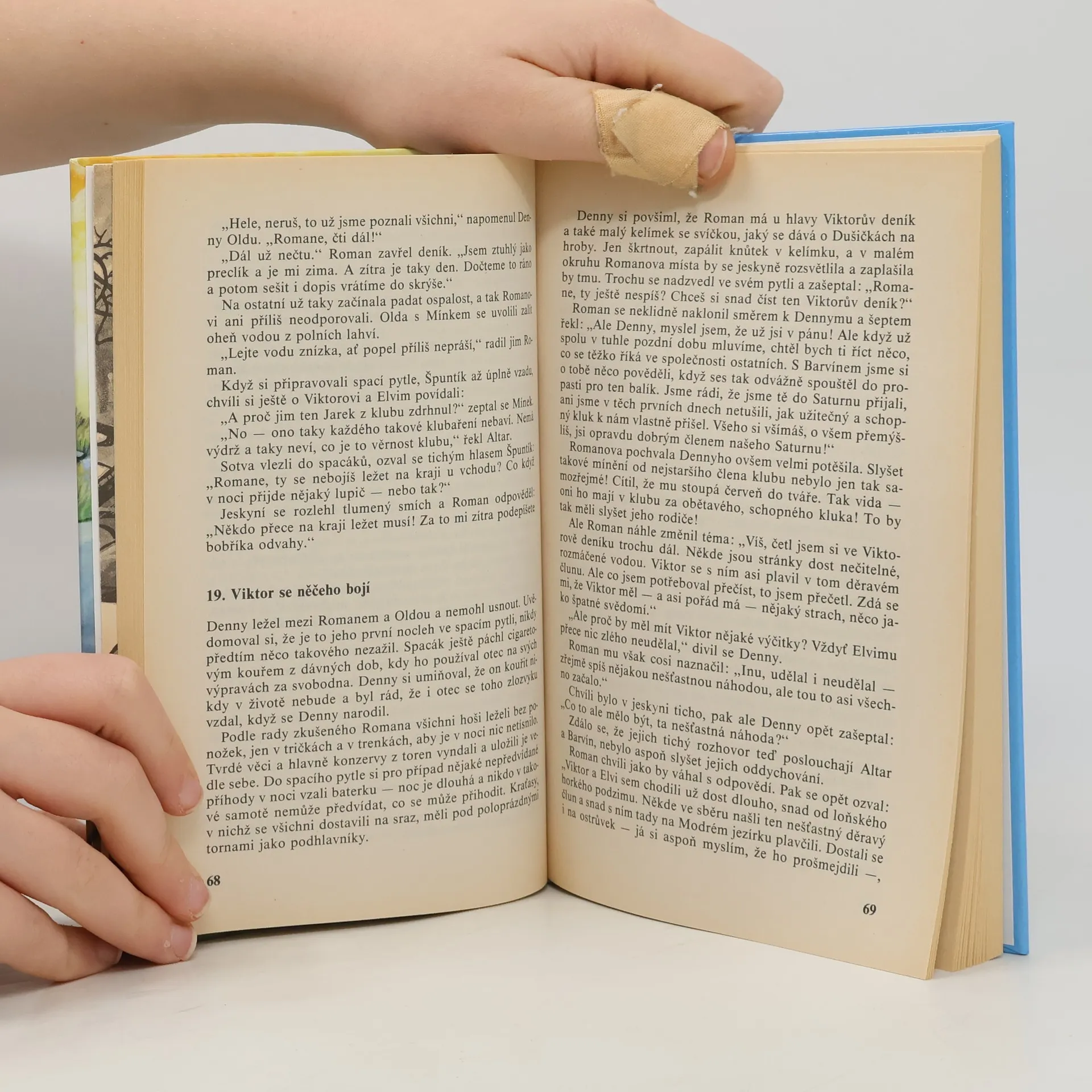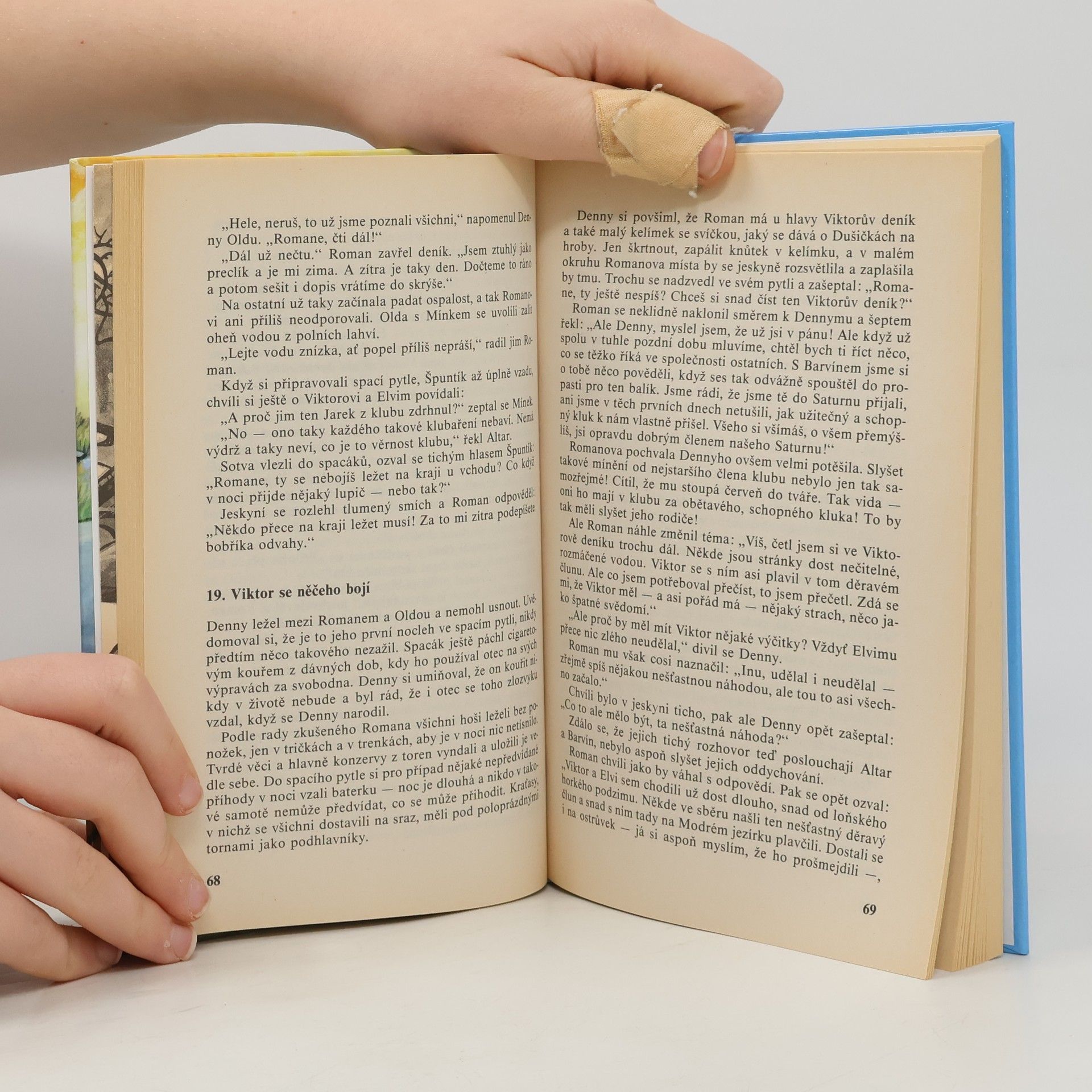 Hlavní postavou knihy je třináctiletý sportovec Denny, který se vážně zraní na kluzišti. V nemocnici se seznámí s vrstevníkem Oldou a ten jej později přivede do klubu Saturn. S novými kamarády prožije Denny mnohá dobrodružství. Jednou se společně vydají do opuštěného lomu pro jakousi namodralou hlínu, kterou vykupují dva kumpáni, Haryk a Milda. Přitom objeví krasovou oblast plnou skalisek a podzemních prostor, částečně nepřístupných. U jezera velké rozlohy přijdou na stopu dvou neznámých školáků a zjistí, že jeden záhadně zmizel a druhý ho marně hledá. Pouze zpola zatopený člun skýtá jakési tragické vysvětlení. Rozhodnou se pomoci kamarádovi v jeho pátrání a rozluštit záhadu. Na tomto nádherném místě vrcholí později jejich příběh prázdninovým táborem. Ilustroval Miroslav Schönberg. Poznámka: Třetí vydání, obsahuje jak přidané čtyří kapitoly (oproti prvnímu vydání), tak aktualizovanou ediční poznámku (Václav Nosek-Windy). Zajímavostí je také to, že nejdříve vyšla ve třech dílech jako komiks (kreslený Kájou Saudkem).