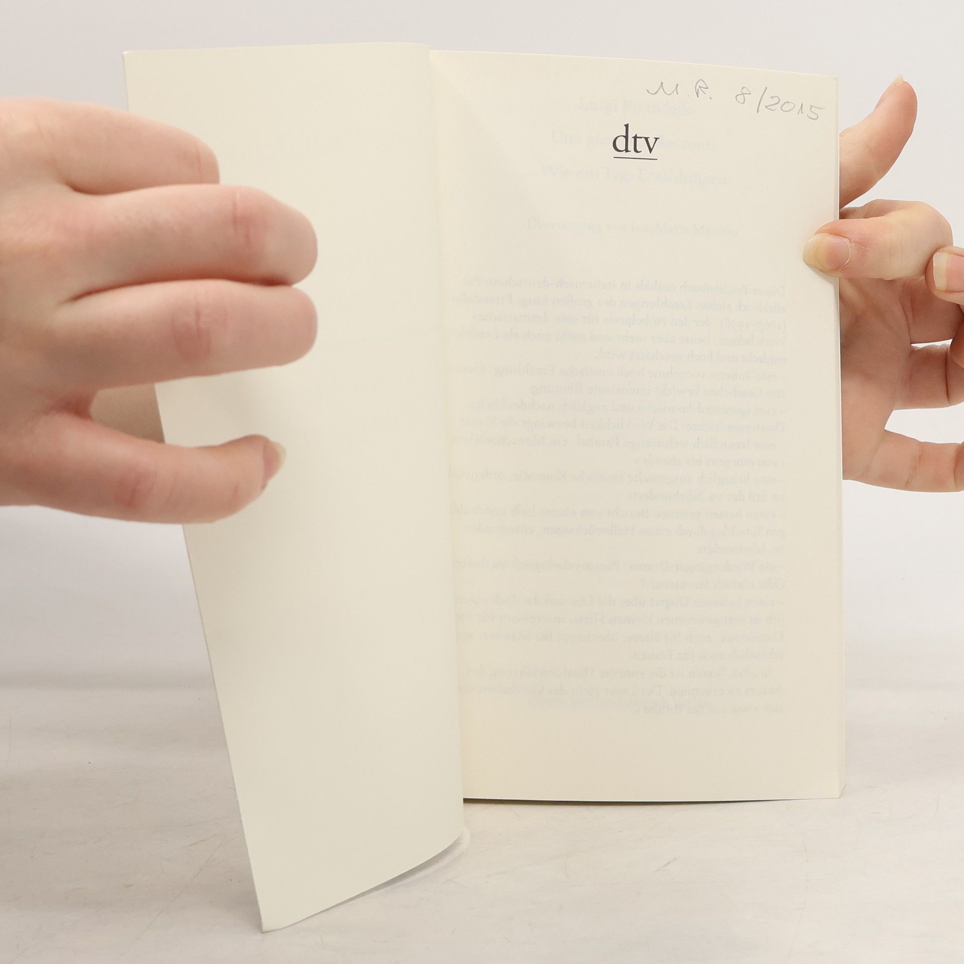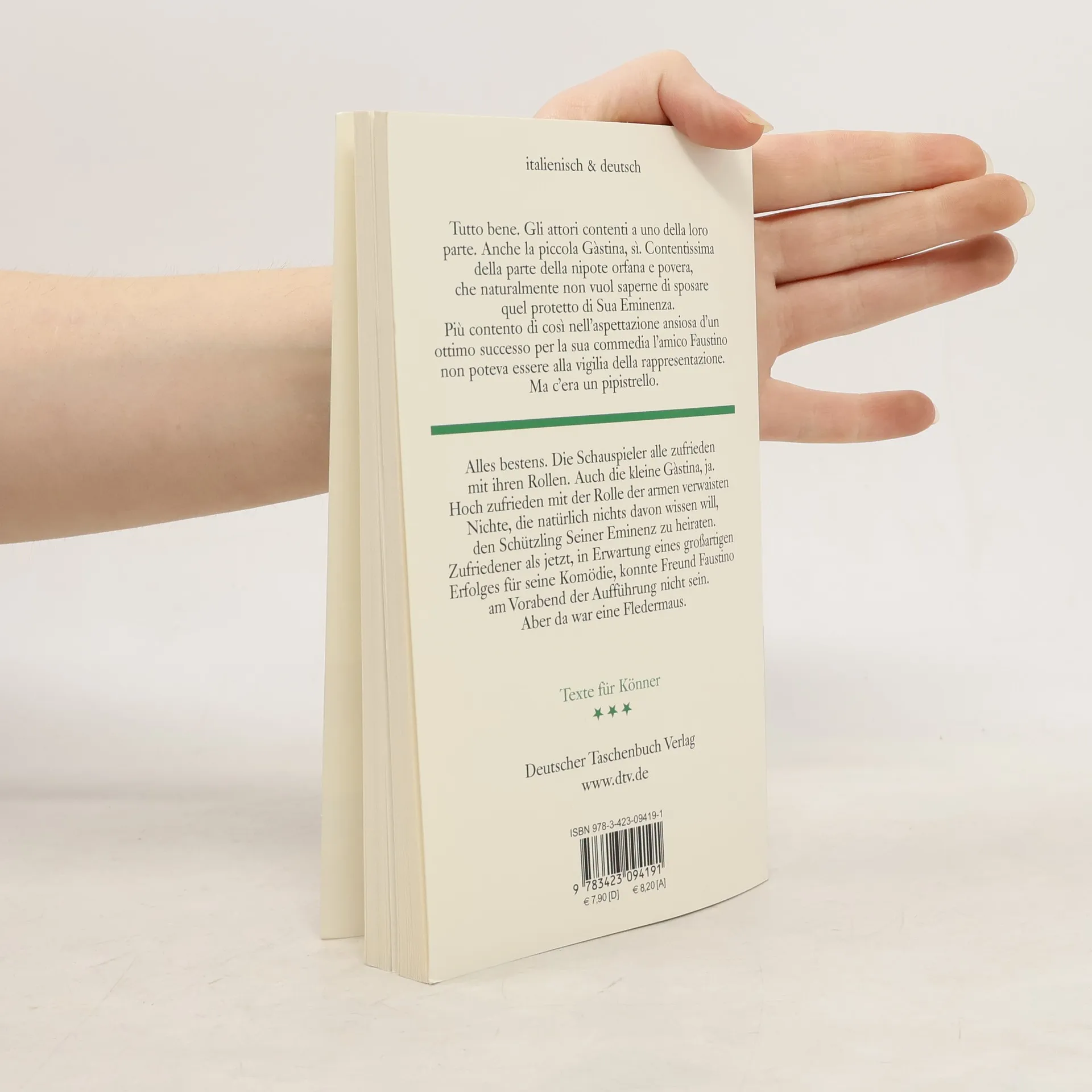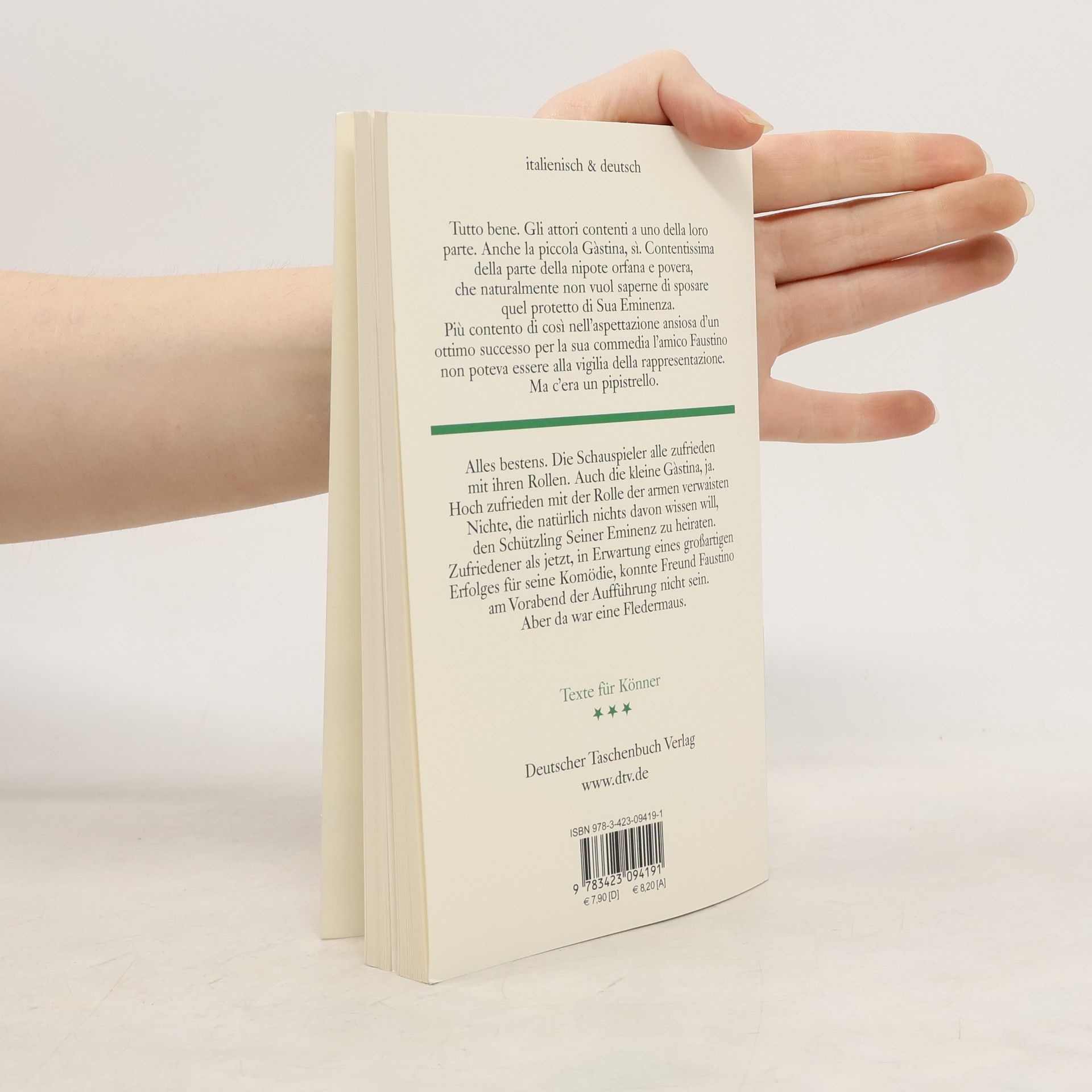 Acht Erzählungen des Literaturnobelpreisträgers Luigi Pirandello in italienisch-deutschem Paralleldruck Luigi Pirandello, der große Stückeschreiber (am bekanntesten 'Sechs Personen suchen einen Autor' und 'Die Riesen vom Berge') hat 240 Erzählungen verfasst. Pirandello erzählt realistisch und surrealistisch, lustig und traurig, behaglich und dramatisch, beängstigend und räsonierend - er kann einfach alles. Er ist der klassische moderne Erzähler zwischen Verga und Moravia. Inhalt: - La prova - Die Probe - Visita - Besuch - Il pipistrello - Die Fledermaus - Una giornata - Wie ein Tag - La giara - Der Krug - Cinci - Cinci - Effetti d'un sogno interrotto - Wirkungen eines unterbrochenen Traumes - Dialogo tra il Gran Me e il piccolo me - Dialog zwischen Großem Ich und kleinem ich